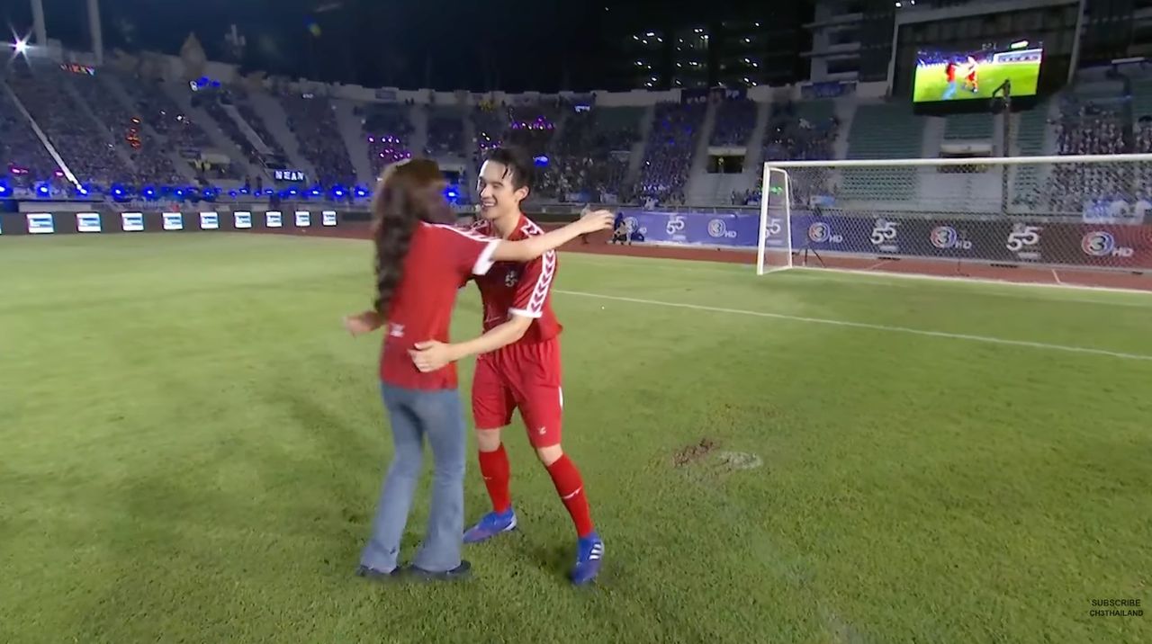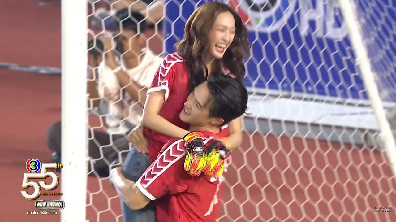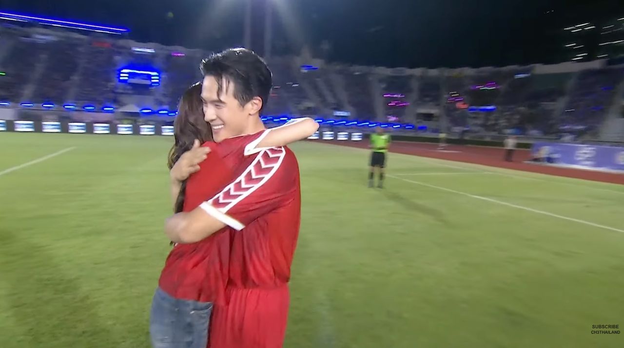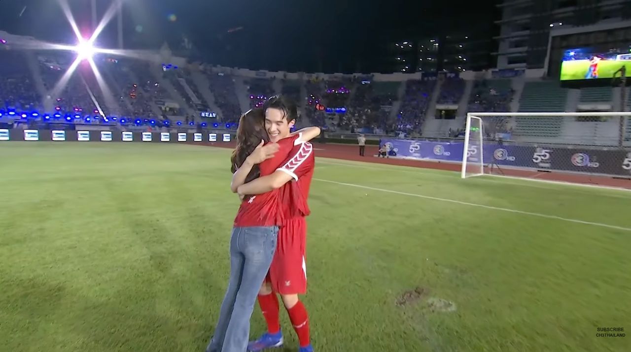 และพอถึงคราวที่เจมส์เตะลูกโทษเข้า สาวพายก็วิ่งมาให้กำลังใจแฟนหนุ่มทันทีด้วยการสวมกอดกัน ทำเอาคนในสนาม ทั้งเพื่อนๆ และแฟนๆ ต่างส่งเสียงแซวกันยกใหญ่ ส่วนคนดูทางบ้านได้แต่ฟินๆ กับโมเมนต์หวานๆ ของคู่รักดาราในวันนี้