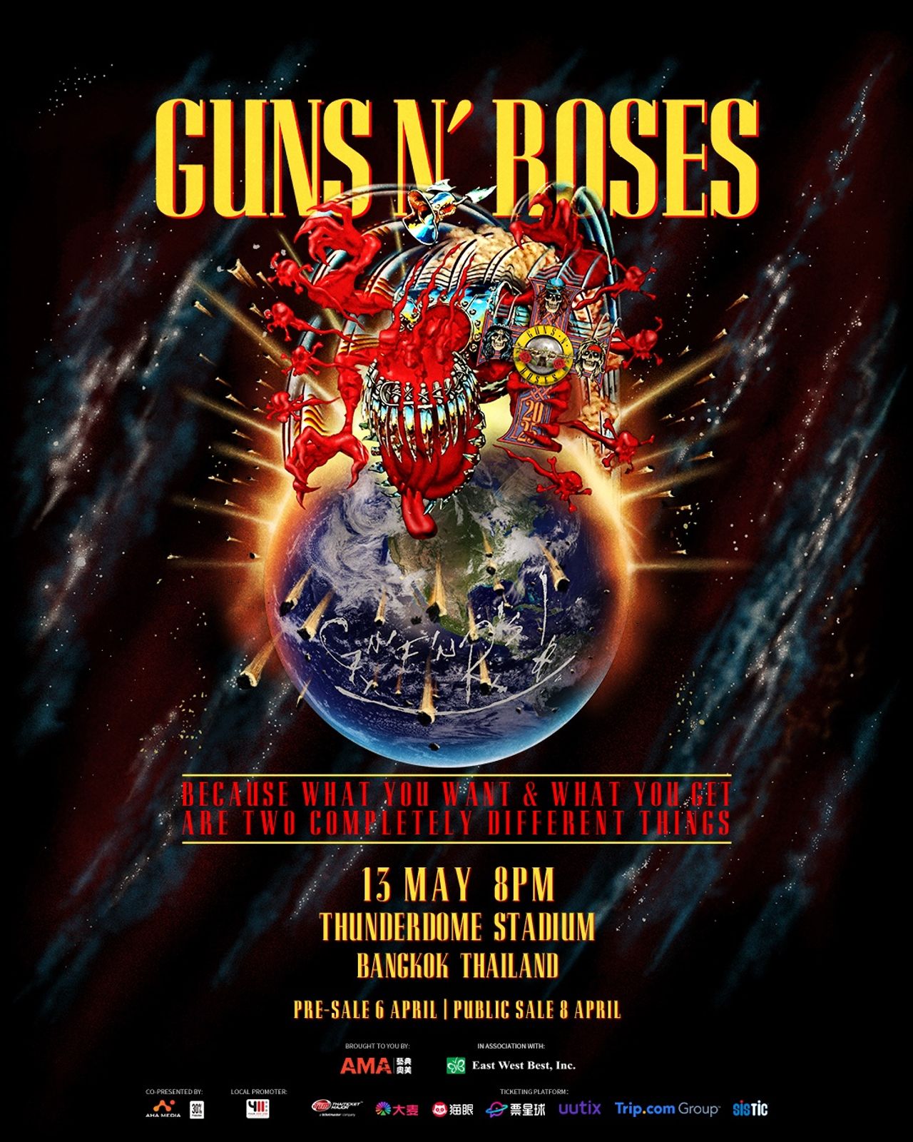 และแล้ววันนี้ กันส์ แอนด์ โรสเซส (Guns N' Roses) ก็ประกาศการกลับมายังประเทศไทยอีกครั้งตามคำเรียกร้องกับคอนเสิร์ต Guns N' Roses 2025 World Tour – Bangkok ซึ่งมาพร้อมธีมสุดเท่ Because What You Want & What You Get Are Two Completely Different Things กำหนดแสดงในวันอังคารที่ 13 พฤษภาคม 2568 นี้ เพียงคืนเดียวเท่านั้น! เวลา 20:00 น. ณ ธันเดอร์โดม สเตเดียม กรุงเทพมหานคร ประเทศไทย ซึ่งคอนเสิร์ตนี้เป็นส่วนหนึ่งของเวิลด์ทัวร์ปี 2025 ของพวกเขานั่นเอง