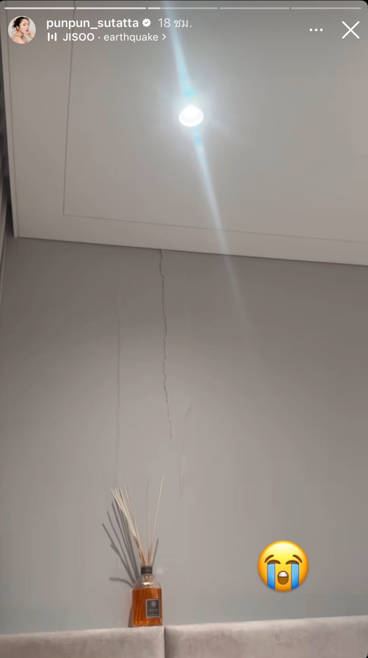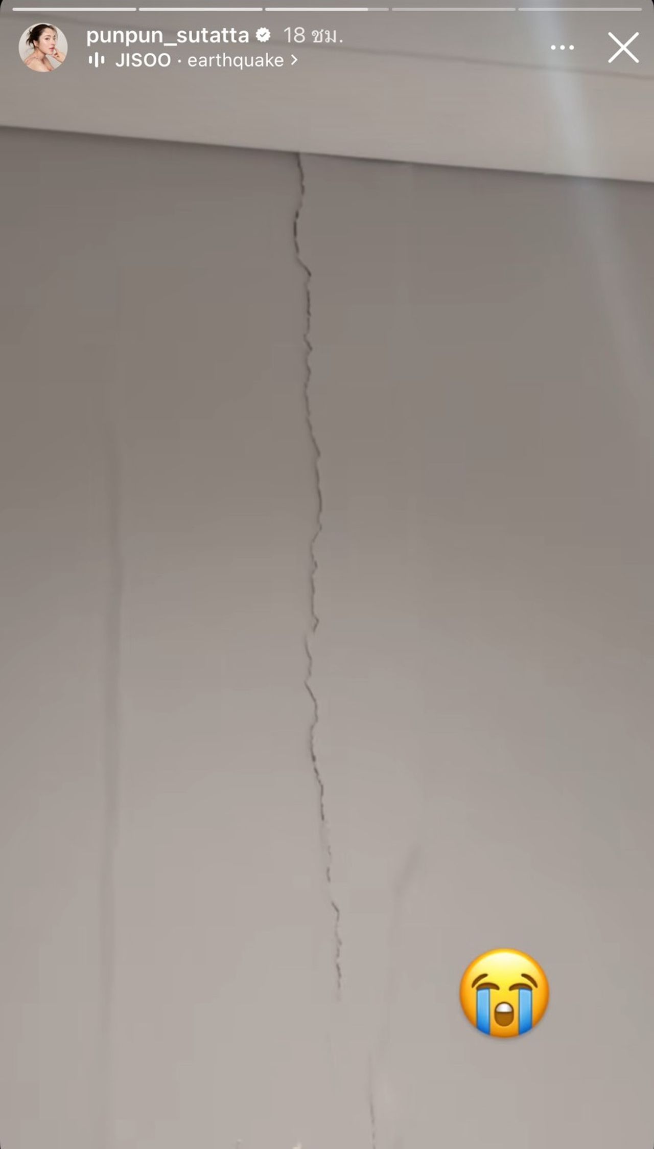 ด้านนางเอกสาว ปันปัน สุทัตตา อุดมศิลป์ ก็เป็นอีกคนในวงการบันเทิงที่ได้รับผลกระทบจากเหตุแผ่นดินไหวด้วยเช่นกัน เพราะคอนโดฯ ห้องใหม่ที่เจ้าตัวเพิ่งเข้าไปอยู่ได้ไม่นานเกิดรอยร้าวหลังมีเหตุแผ่นดินไหว ซึ่งเจ้าตัวได้โพสต์ไอจีสตอรี่ @punpun_sutatta เป็นคลิปกำแพงคอนโดฯ มีรอยร้าวเป็นทางยาวแบบชัดเจน พร้อมทั้งใส่อีโมจิร้องไห้
