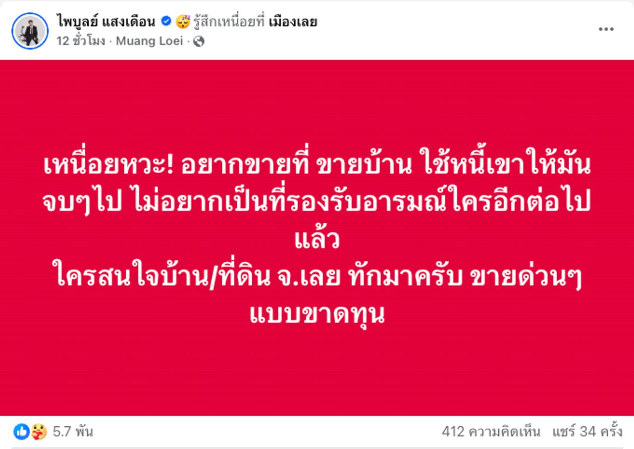 "เหนื่อยว่ะ! อยากขายที่ ขายบ้าน ใช้หนี้เขาให้มันจบๆ ไป ไม่อยากเป็นที่รองรับอารมณ์ใครอีกต่อไปแล้ว ใครสนใจบ้าน/ที่ดิน จ.เลย ทักมาครับ ขายด่วนๆ แบบขาดทุน"