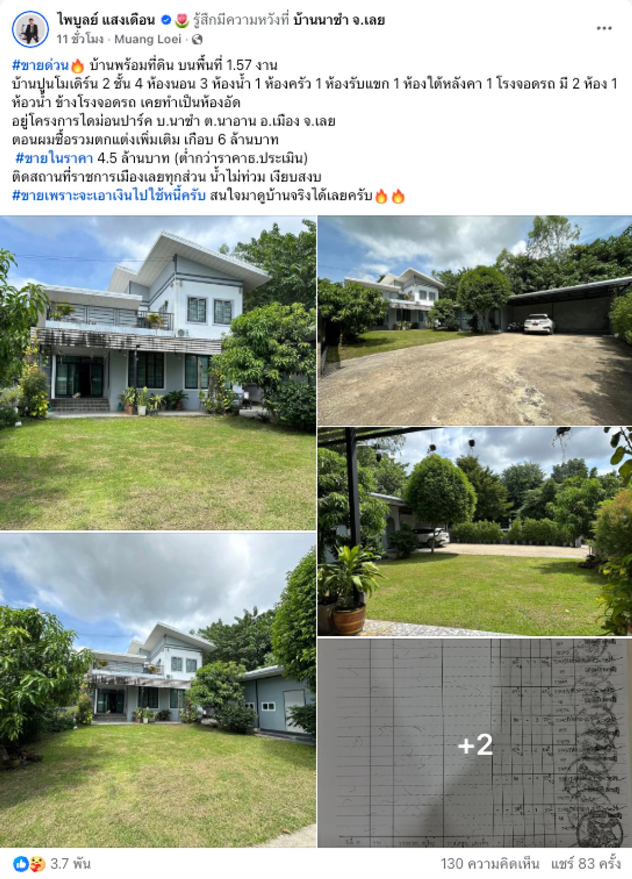"#ขายด่วน บ้านพร้อมที่ดิน บนพื้นที่ 1.57 งาน บ้านปูนโมเดิร์น 2 ชั้น 4 ห้องนอน 3 ห้องน้ำ 1 ห้องครัว 1 ห้องรับแขก 1 ห้องใต้หลังคา 1 โรงจอดรถ มี 2 ห้อง 1 ห้องน้ำ ข้างโรงจอดรถ เคยทำเป็นห้องอัด อยู่โครงการไดม่อนปาร์ค บ.นาซำ ต.นาอาน อ.เมือง จ.เลย ตอนผมซื้อรวมตกแต่งเพิ่มเติม เกือบ 6 ล้านบาท #ขายในราคา 4.5 ล้านบาท (ต่ำกว่าราคาธ.ประเมิน) ติดสถานที่ราชการเมืองเลยทุกส่วน น้ำไม่ท่วม เงียบสงบ #ขายเพราะจะเอาเงินไปใช้หนี้ครับ สนใจมาดูบ้านจริงได้เลยครับ"