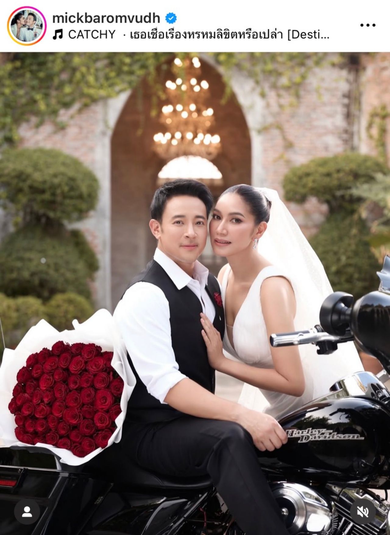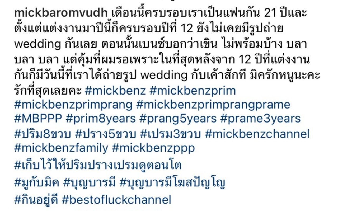 งานนี้หนุ่มมิคก็ได้โพสต์ภาพดังกล่าว พร้อมแคปชั่นว่า "เดือนนี้ครบรอบเราเป็นแฟนกัน 21 ปีและตั้งแต่แต่งงานมาปีนี้ก็ครบรอบปีที่ 12 ยังไม่เคยมีรูปถ่าย wedding กันเลย ตอนนั้นเบนซ์บอกว่าเขิน ไม่พร้อมบ้าง บลา บลา บลา แต่คุ้มที่ผมรอเพราะในที่สุดหลังจาก 12 ปีที่แต่งงานกันก็มีวันนี้ที่เราได้ถ่ายรูป wedding กับเค้าสักที มิครักหนูนะคะ รักที่สุดเลยค่ะ"
