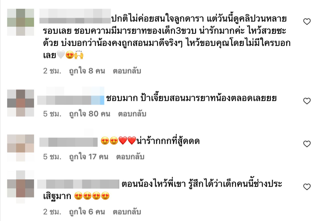 "ตอนที่ยกรถเข็นเสร็จ แล้วน้องหันมาไหว้คือน่ารักมากลูก, น่ารักมากลูก ไหว้ขอบคุณด้วย ถูกสั่งสอนมาดี, น่ารักจังเลยลูกเกล ไหว้ขอบคุณผู้ใหญ่ด้วย, จังหวะที่พี่ๆยกขึ้นบันไดพอวางพื้นปุ๊บแล้วเจ๊ไหว้ขอบคุณ คือแบบที่สุดของที่สุดจริงๆค่ะ โอ้ยยยยยยยรักเจ๊, ชอบมาก ป้าเจี๊ยบสอนมารยาทน้องตลอดเลยยย, ดาราสาว มารยาทงามมากลูก, เป็นเด็ก 3 ขวบ ที่รู้จักความหมายของคำว่าขอบคุณจริง"
