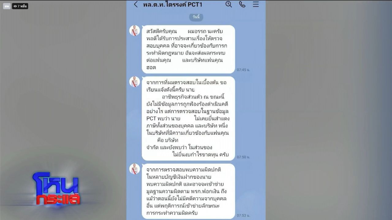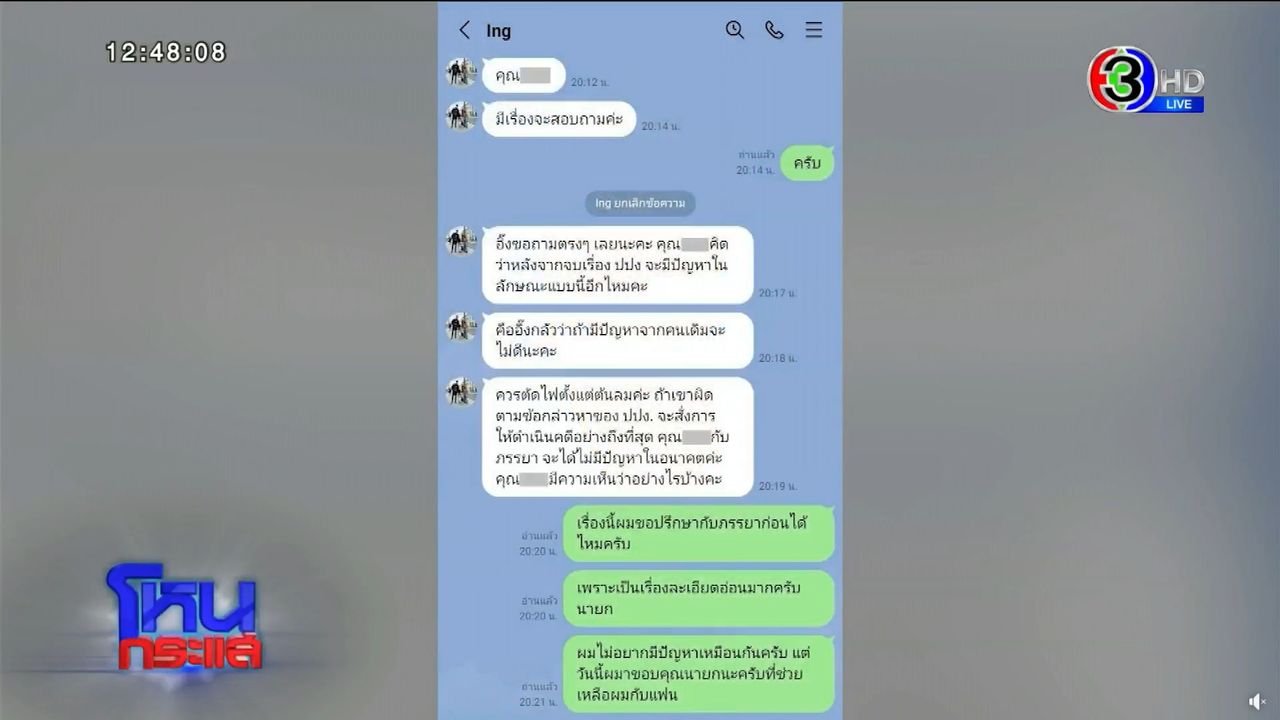 ล่าสุด คะน้า ริญญารัตน์ และ กัน จอมพลัง มาร่วมรายการ “โหนกระแส” ทางช่อง 3 ซึ่งในระหว่างที่คะน้าเล่าเรื่องที่ถูกชายคนนี้หลอกและแอบอ้างผู้ใหญ่คนดังต่างๆ เจ้าตัวก็ได้เปิดภาพแชตไลน์ที่ฝ่ายชายส่งมาให้ โดยอ้างว่าคุยกับ น.ส.แพทองธาร ชินวัตร นายกรัฐมนตรี รวมถึง พล.ต.ท.ไตรรงค์ ผิวพรรณ ผู้บัญชาการตำรวจสืบสวนสอบสวนอาชญากรรมทางเทคโนโลยี (ผบช.สอท.) ในเรื่องเกี่ยวกับขอให้ช่วยเหลือเรื่องที่คะน้าอาจจะมีความสัมพันธ์เกี่ยวข้องกับเงินเทา เพราะคะน้าทำธุรกิจร่วมกับแฟนเก่า โดยเขาอ้างว่าแฟนเก่าคะน้ามีการฟอกเงิน แล้วอาจโดนอายัดทรัพย์ เพราะถือหุ้นร่วมกัน แต่เรื่องนี้ไม่จริง ตนไม่ได้เกี่ยวข้อง