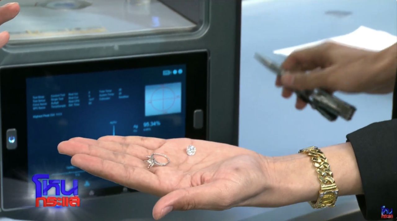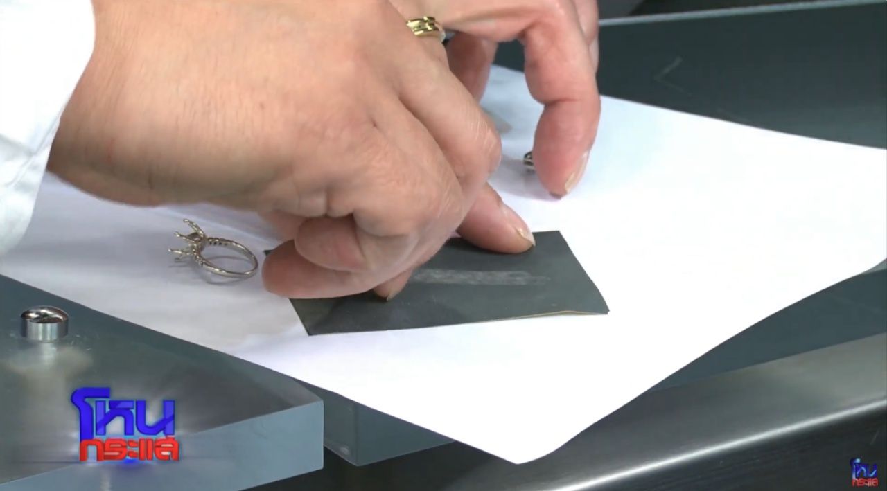 - ส่วนแหวนเพชรเมื่อเอาไปเอ็กซเรย์แล้ว พบว่าตรงช่วงตัวเรือนแหวนเป็นเงินกับทองแดง ส่วนตัวเพชรไม่ต้องเช็คเลย เพราะด้วยจากประสบการณ์ที่ผ่านมาคือ ตัวเรือนแหวนหลักร้อยจะเอามาครอบเพชรหลักล้าน มันไม่ได้อยู่แล้ว และเมื่อเอาตัวเพชรไปขัดกับกระดาษทราย พบว่าเป็นของปลอม เพราะขัดไปตัวเพชรเรียบเลย แบบนี้ตกเม็ดละไม่เกิน 300 บาท หากเป็นเพชรแท้เมื่อขูดกับกระดาษทรายสภาพจะเหมือนเดิม ในส่วนของสร้อยคอคือเงินชุบ มูลค่าประมาณ 300 บาท