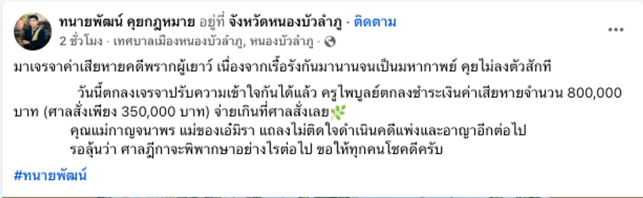 ทางด้านทนายพัฒน์ ทนายของฝั่งแม่เอ๋ มิรา ก็ได้โพสต์ข้อความผ่านทางเฟซบุ๊กของตัวเองเกี่ยวกับคดีดังกล่าวว่า "มาเจรจาค่าเสียหายคดีพรากผู้เยาว์ เนื่องจากเรื้อรังกันมานานจนเป็นมหากาพย์ คุยไม่ลงตัวสักที