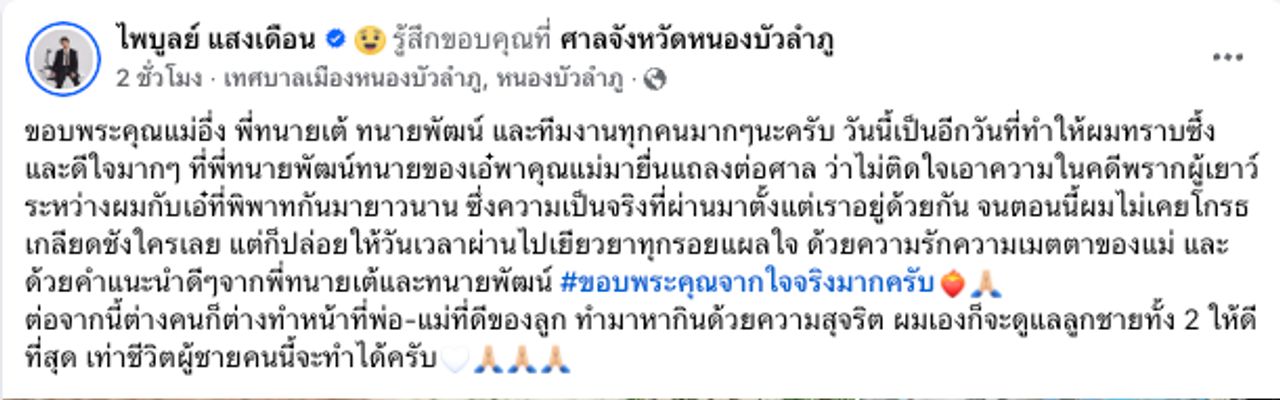 "ขอบพระคุณแม่อึ่ง พี่ทนายเต้ ทนายพัฒน์ และทีมงานทุกคนมากๆ นะครับ วันนี้เป็นอีกวันที่ทำให้ผมซาบซึ้งและดีใจมากๆ ที่พี่ทนายพัฒน์ทนายของเอ๋พาคุณแม่มายื่นแถลงต่อศาลว่าไม่ติดใจเอาความในคดีพรากผู้เยาว์ระหว่างผมกับเอ๋ที่พิพาทกันมายาวนาน