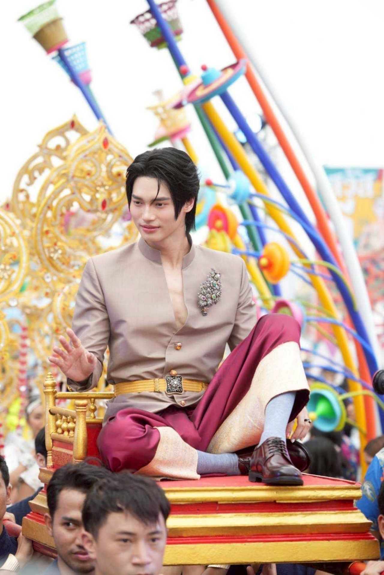 ในขบวนแห่ยังมีตัวแทนคนรุ่นใหม่ “วิน-เมธวิน โอภาสเอี่ยมขจร” ร่วมสืบสานประเพณีสงกรานต์ไทย งามสง่าด้วยชุดสูทผ้าไหมทอแขนยาว โจงกระเบนสีแดง ในลุคทันสมัยสากล ออกแบบโดย ผศ.ดร. สุรัตน์ จงดา ผู้ออกแบบเครื่องแต่งกายชุดไทย ผลงานโด่งดังจาก มิสไทยแลนด์ยูนิเวิร์ส ภาพยนตร์-ซีรีย์ศรีอโยธยา ละครแม่หยัว และสวมใส่เครื่องประดับจากจิวเวลรี่แท้ ทองโบราณ พลอยทับทิมล้อมเพชร ของสะสมของคุณโจ๊กเช่นกัน สำหรับขบวนแห่นางสงกรานต์วันที่ 11 เม.ย. 68 พบ อิงฟ้า วราหะ - ชาล็อต ออสติน วันที่ 12 เม.ย. 68 พบ ลีน่า ลลินา-หมิว ณัชชา และวันที่ 13 เม.ย. 68 พบ ชมพู่ อารยา - น้องแอบิเกล ในชุดไทยร่วมสมัยและเครื่องประดับหาชมยากจากนักสะสมและผู้ชื่นชอบเครื่องประดับโบราณ มูลค่ารวมกว่า 440 ล้านบาท