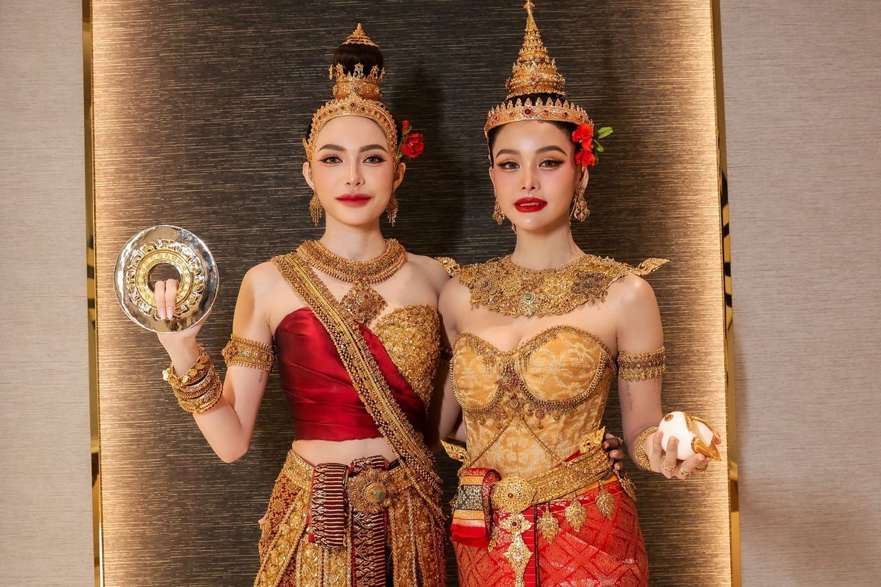 นำขบวนโดย “อิงฟ้า วราหะ” สวยสะกดหยุดลมหายใจ ในชุดเทพธิดาโบราณที่ได้แนวคิดมาจากภาพปฏิมากรรมเทพธิดาโบราณ ภายในวัดพระศรีรัตนศาสดาราม งามสง่าด้วยกรอบถันสลักดุนทองคำบนเกาะอกผ้าไหมสีทอง นุ่งผ้าจีบหน้านางสีแดงจากผ้ายกไหมทอง ศีรษะสวมเกี้ยวมงคลและเกี้ยวยอด เครื่องประดับทองคำแท้โบราณ ซึ่งเป็นของสะสมของคุณโจ๊ก พุทธพงษ์ เพียรเจริญ นักสะสมเครื่องประดับโบราณ เบอร์ต้นๆ ของไทย โดยมี ผศ.ดร.สุรัตน์ จงดา เป็นผู้ออกแบบเครื่องแต่งกาย ผลงานการออกแบบที่โดดเด่น ได้แก่ มิสไทยแลนด์ยูนิเวิร์ส ภาพยนตร์-ซีรีส์ศรีอโยธยา และละครเรตติ้งท็อปฮิต แม่หยัว