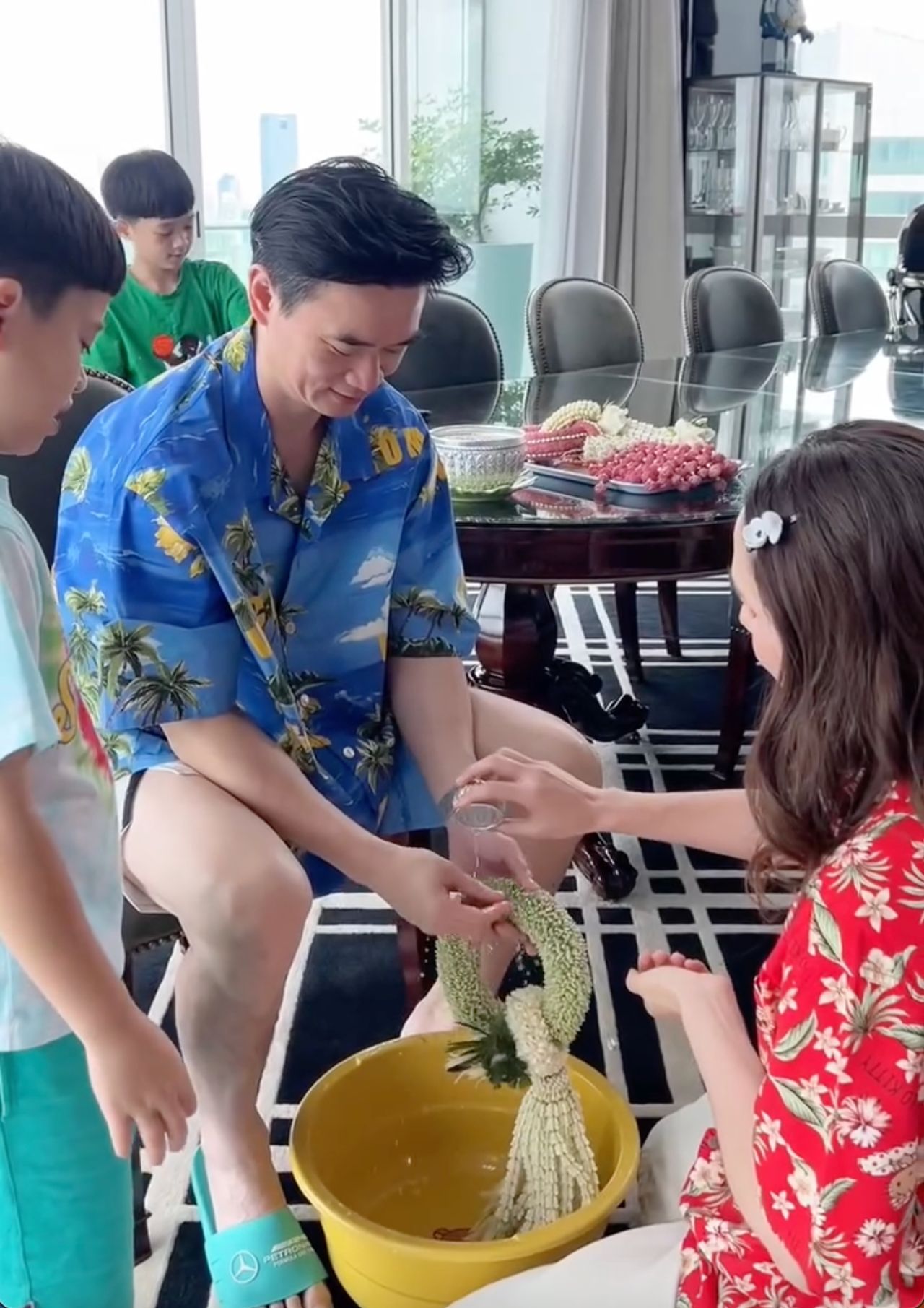 ซึ่งในเทศกาลสงกรานต์ปีนี้ แม่ชมก็พาลูกๆ รดน้ำขอพรพ่อน็อตเหมือนทุกๆ ปีที่ผ่านมา ซึ่งในปีนี้เด็กๆ นำพวงมาลัยสวยๆ มาไหว้ขอพรพ่อน็อต ซึ่งพ่อน็อตก็ให้พรกลับไป พร้อมกับหอมลูกๆ ฟอดใหญ่ด้วยความรัก