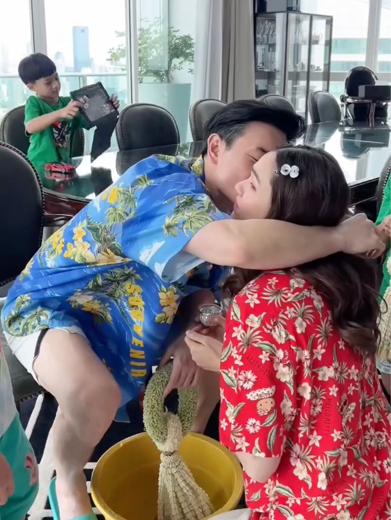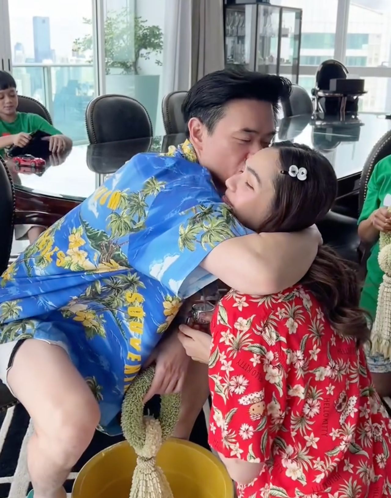 ก่อนที่พ่อน็อตจะแสดงความรักต่อแม่ชม ด้วยการกอดและหอมแก้มภรรยาแบบชื่นใจด้วยความรักต่อหน้าคนในครอบครัว เรียกว่าหวานเจี๊ยบจนทำเอาคนที่ดูคลิปรู้สึกเขินไปกับโมเมนต์นี้ของพ่อน็อตแม่ชมไม่น้อย