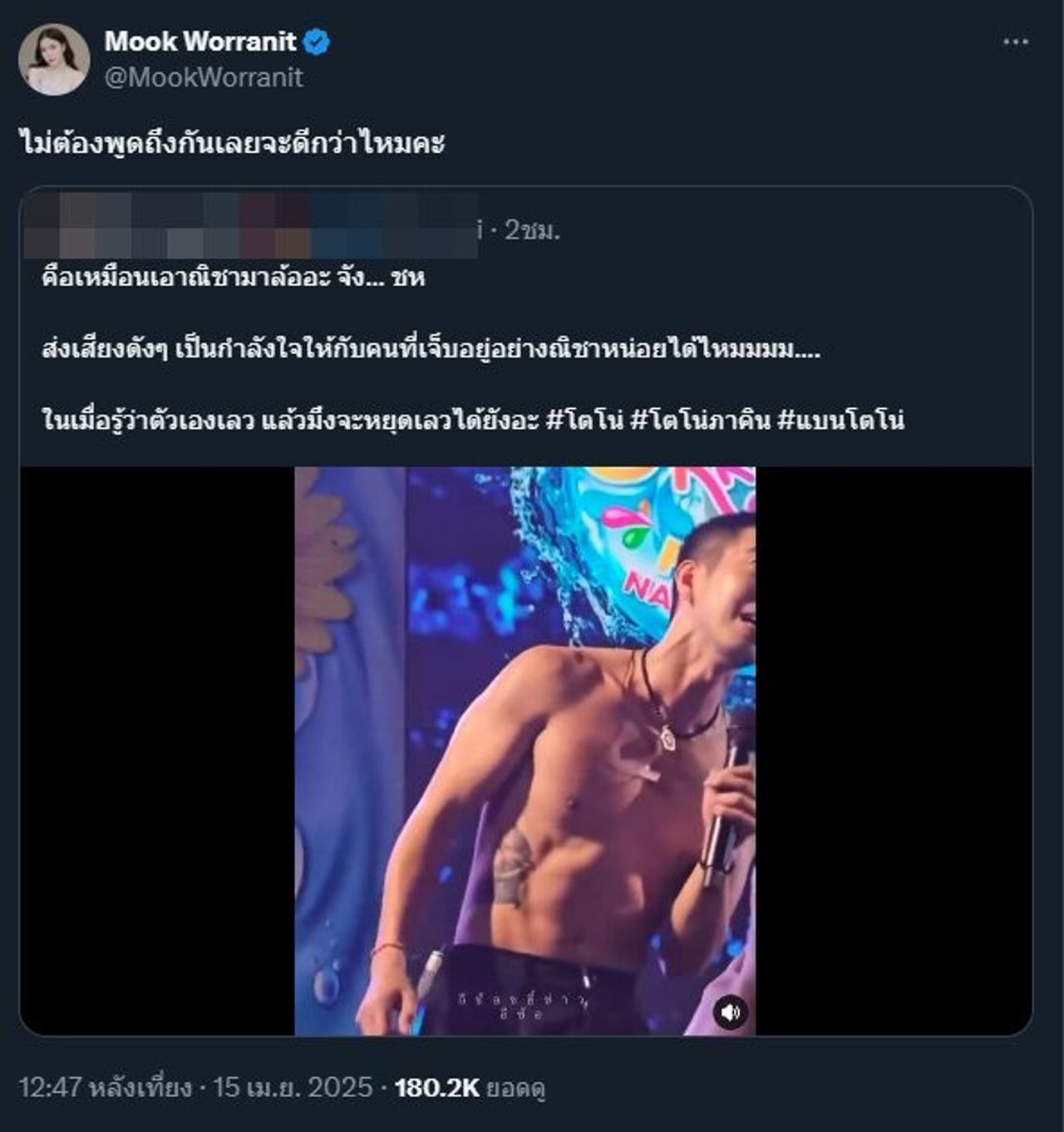 ล่าสุดนางเอกสาว มุก วรนิษฐ์ เพื่อนสาวคนสนิทของ ณิชา ณัฏฐณิชา ก็ได้รีทวีตถึงคลิปวิดีโอของ โตโน่ พร้อมเขียนข้อความว่า “ไม่ต้องพูดถึงกันเลยจะดีกว่าไหมคะ” งานนี้ทำเอาชาวเน็ตเข้ามาคอมเมนต์ในโพสต์ของมุกมากมาย โดยทุกคนเห็นด้วยกับเธอ ว่าอยากให้โตโน่หยุดพูดถึงณิชาบนเวทีได้แล้ว