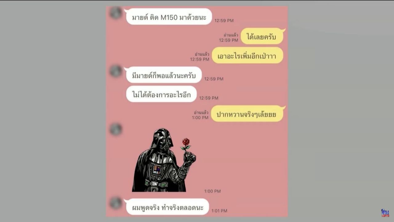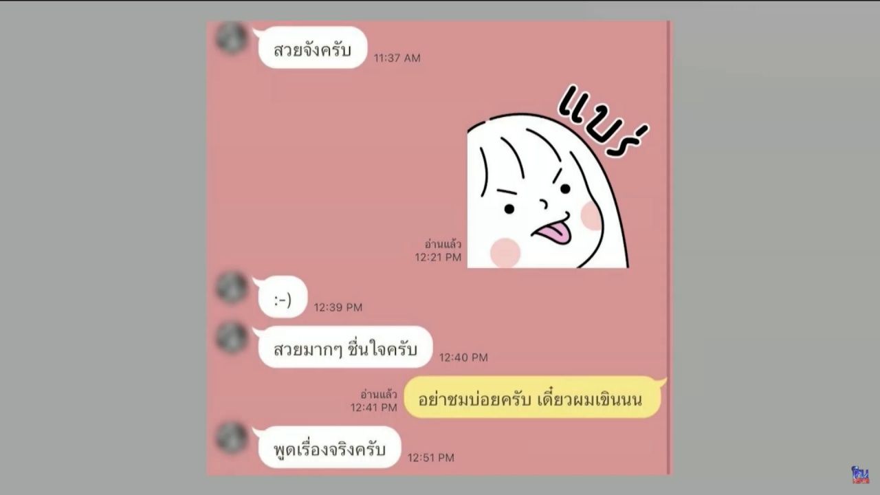 - จากนั้นเปิดแชตที่โตโน่บอกว่า “มีมายด์ก็พอแล้วนะครับ ไม่ไ้ด้ต้องการอะไรอีก” และส่งอีโมจิส่งกุหลาบ บอกว่า “ผมพูดจริง ทำจริงตลอดนะ” มายด์บอกว่าอาจจะเพราะว่าไม่ได้รับอะไรแบบนี้มาสักพัก