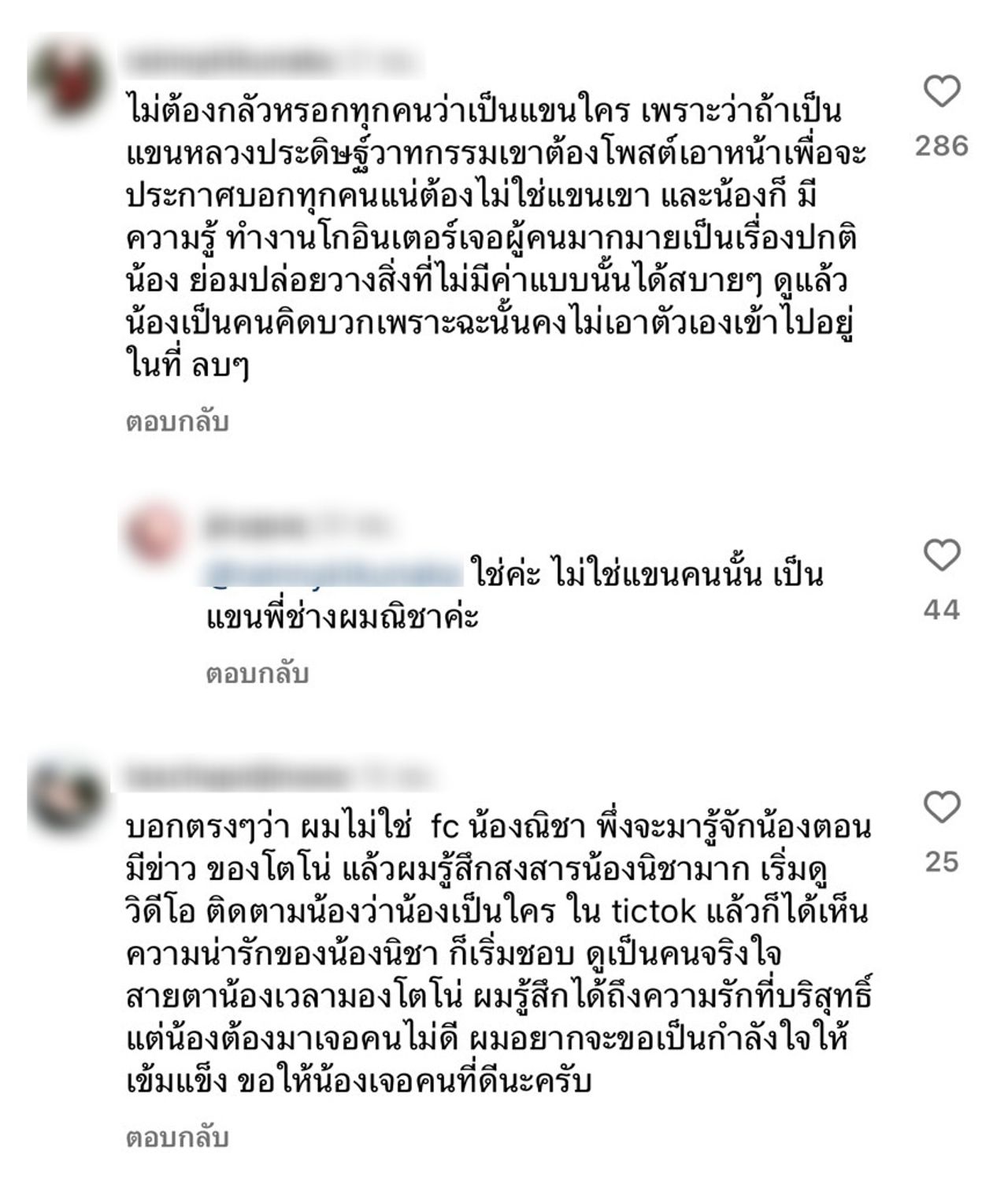 ในขณะที่มีชาวเน็ตบางคนแสดงความคิดเห็นว่า “ไม่ต้องกลัวหรอกทุกคนว่าเป็นแขนใคร เพราะว่าถ้าเป็นแขนหลวงประดิษฐ์วาทกรรมเขาต้องโพสต์เอาหน้าเพื่อจะประกาศบอกทุกคนแน่ต้องไม่ใช่แขนเขา และน้องก็มีความรู้ ทำงานโกอินเตอร์เจอผู้คนมากมายเป็นเรื่องปกติน้อง ย่อมปล่อยวางสิ่งที่ไม่มีค่าแบบนั้นได้สบายๆ ดูแล้วน้องเป็นคนคิดบวกเพราะฉะนั้นคงไม่เอาตัวเองเข้าไปอยู่ในที่ลบๆ” ด้วย