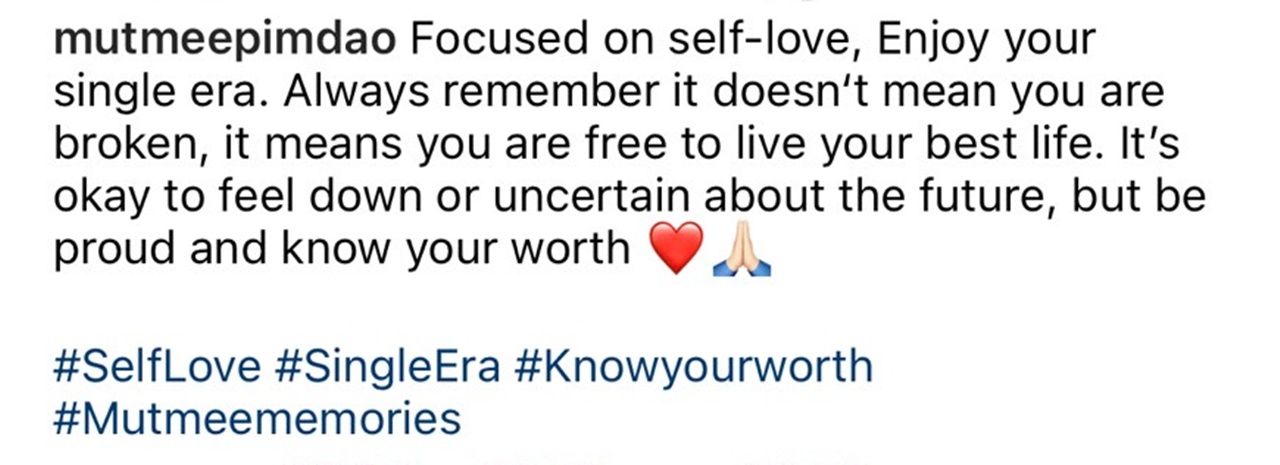 "Focused on self-love, Enjoy your single era. Always remember it doesn’t mean you are broken, it means you are free to live your best life. It’s okay to feel down or uncertain about the future, but be proud and know your worth"