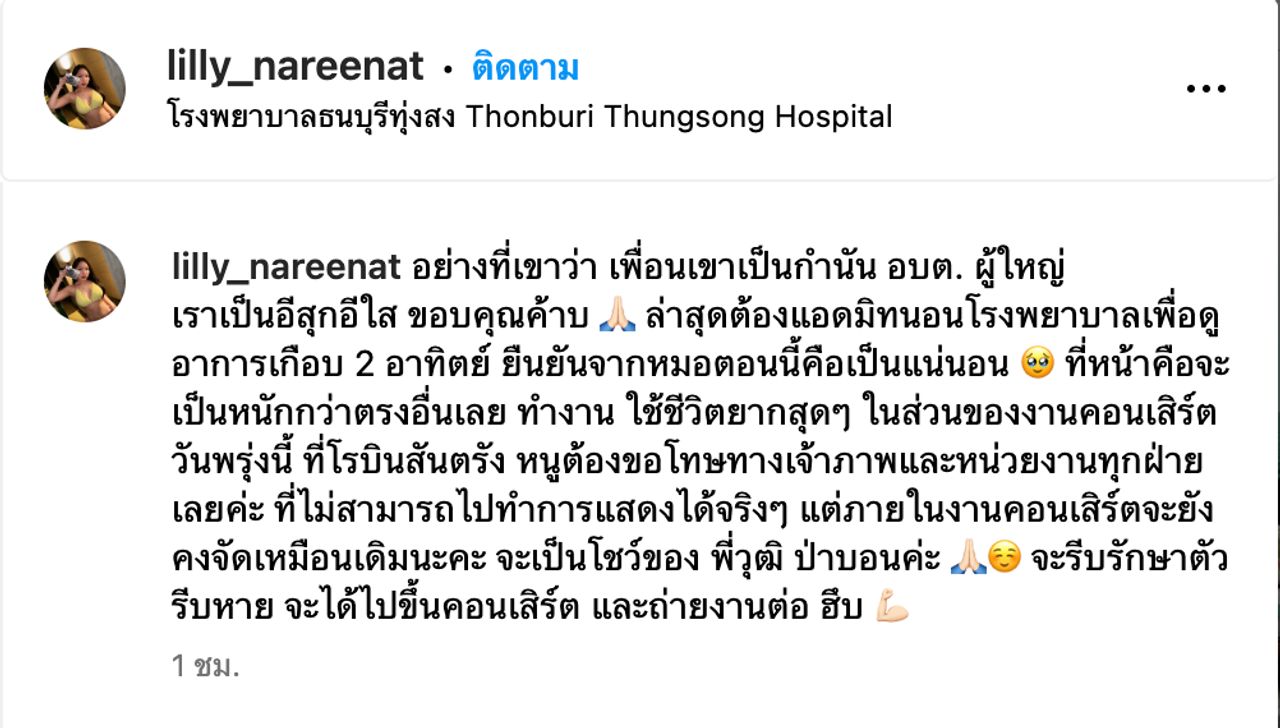 ทำเอาแฟนๆ เป็นห่วงและส่งกำลังใจให้รัวๆ เมื่อนักร้องสาวเจ้าของเพลงดัง เลิกคุยทั้งอำเภอเพื่อเธอคนเดียว อย่าง ลิลลี่ ได้หมดถ้าสดชื่น หรือ นารีนาท เชื้อแหลม ได้แจ้งข่าวพร้อมกับขอโทษเจ้าภาพหลังจากที่เจ้าตัวป่วยต้องนอนโรงพยาบาลเพื่อดูอาการเกือบ 2 อาทิตย์ โดยลิลลี่แจ้งข่าวผ่านทางโซเชียลว่า