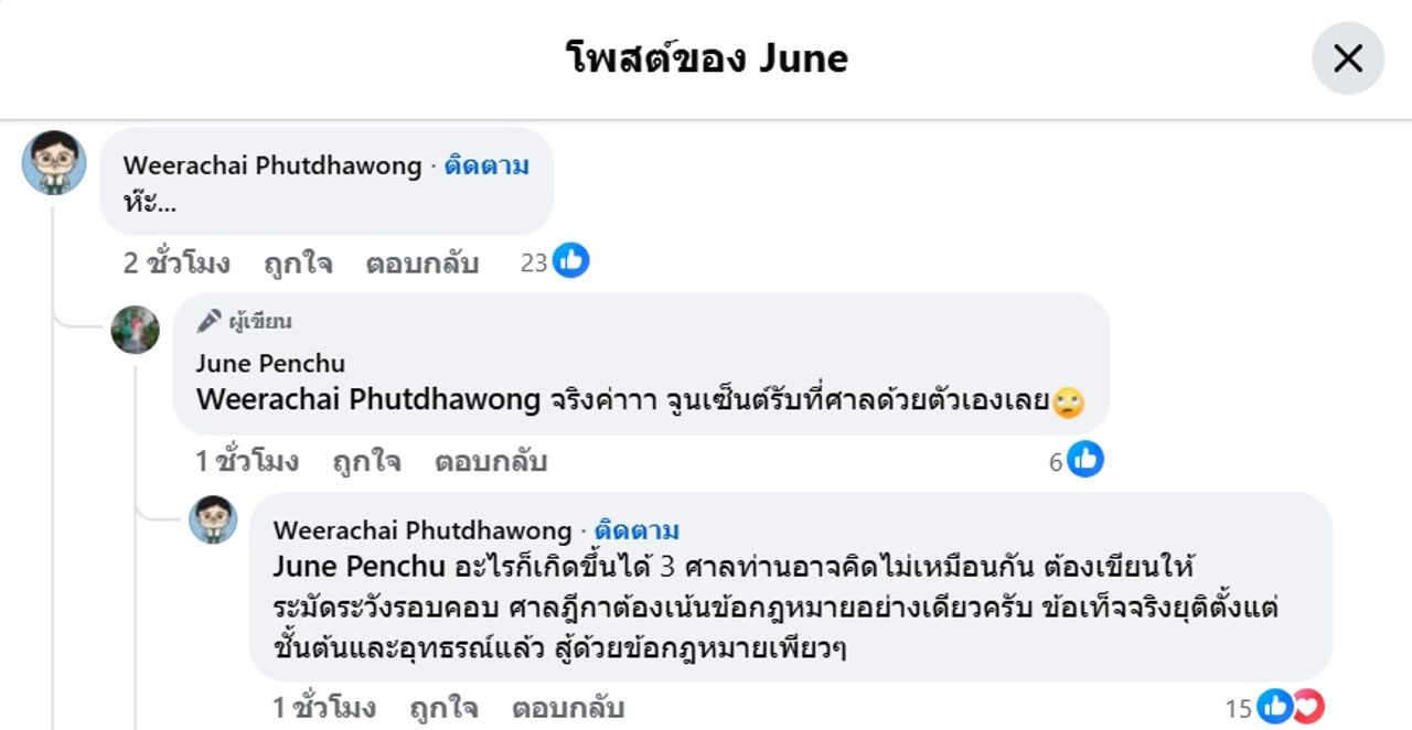 และเมื่อ อ.อ๊อด รศ.ดร.วีรชัย พุทธวงศ์ เข้ามาคอมเมนต์ว่า “หา” จูน เพ็ญชุลี จึงตอบกลับว่า “จริงค่าาา จูนเซ็นต์รับที่ศาลด้วยตัวเองเลย” และใส่อีโมจิมองบนด้วย ก่อนที่ อ.อ๊อด จะคอมเมนต์แนะนำถึงเรื่องนี้ไว้ว่า “อะไรก็เกิดขึ้นได้ 3 ศาลท่านอาจคิดไม่เหมือนกัน ต้องเขียนให้ระมัดระวังรอบคอบ ศาลฎีกาต้องเน้นข้อกฎหมายอย่างเดียวครับ ข้อเท็จจริงยุติตั้งแต่ชั้นต้นและอุทธรณ์แล้ว สู้ด้วยข้อกฎหมายเพียวๆ”