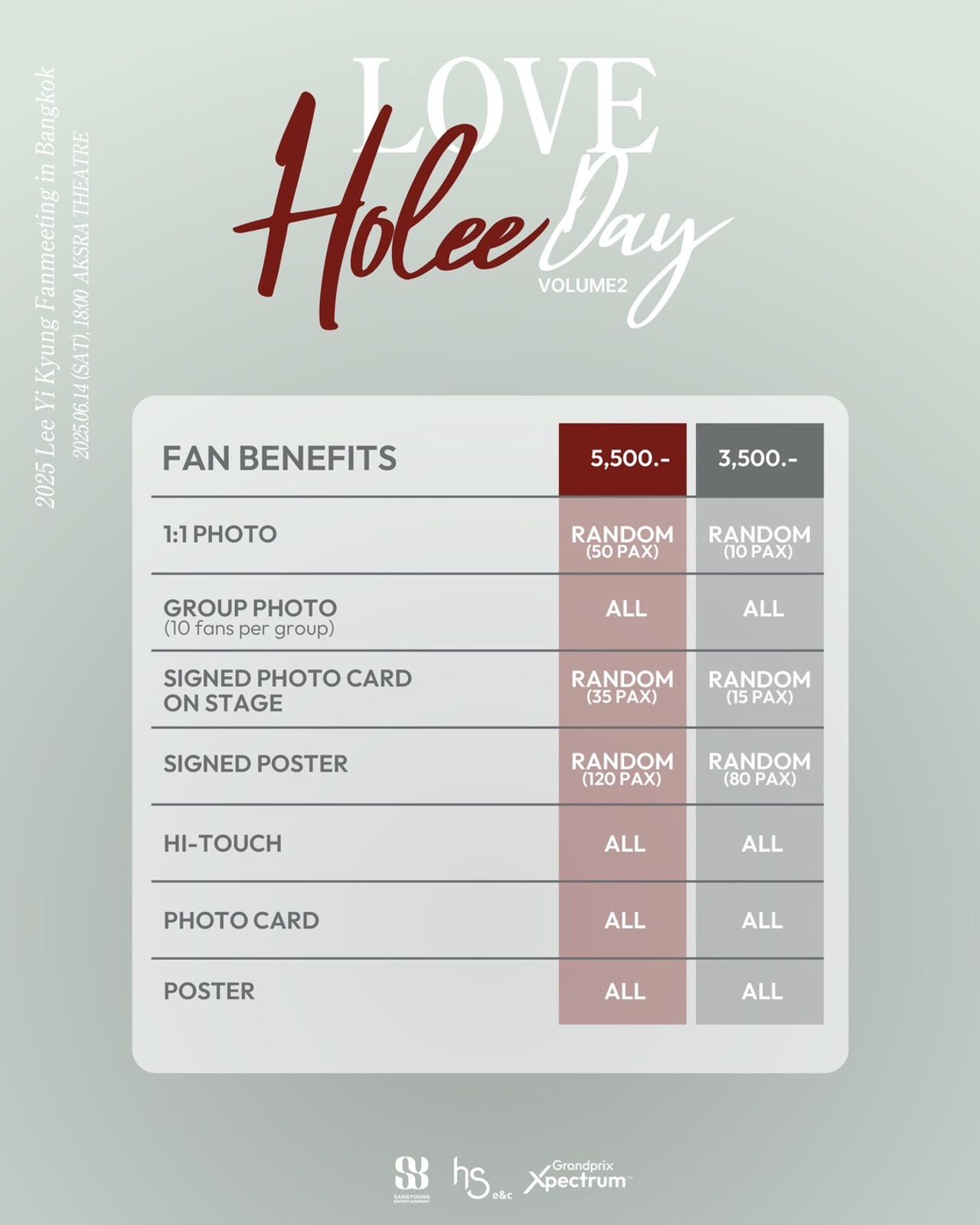 ใครที่ตกหลุมรักอยู่แล้วหรือเพิ่งตกหลุมรัก “อีอีคยอง” จากฝีมือการแสดงหลากหลายบทบาทในซีรีส์ อาทิ ‘Marry My Husband’ , ‘My Dearest‘ , ‘Curtain Call’ , ‘ Royal Secret Agent’ ฯลฯ หรือจะตกหลุมรักตัวตนของเขาจากไลฟ์สไตล์นอกจอ เตรียมพาตัว และหัวใจมาสัมผัสตัวจริงเสียงจริง และเติมเต็มช่วงเวลาที่ดีที่สุดไปกับเขาคนนี้ที่อาจจะมีเซอร์ไพรส์มาให้แบบไม่ทันตั้งตัว เพราะแค่ออเดิร์ฟแรกกับเบเนฟิตก็ดีต่อใจไม่ไหวแล้ว!! งาน LEE YI KYUNG FANMEETING IN BANGKOK <LOVE HOLEE DAY VOLUME 2> เปิดจำหน่ายบัตรวันจันทร์ที่ 5 พฤษภาคม 2568 ตั้งแต่เวลา 12.00 น. เป็นต้นไป ผ่านทาง เว็บไซต์ zipeventapp บัตรราคา 5,500 และ 3,500 บาท