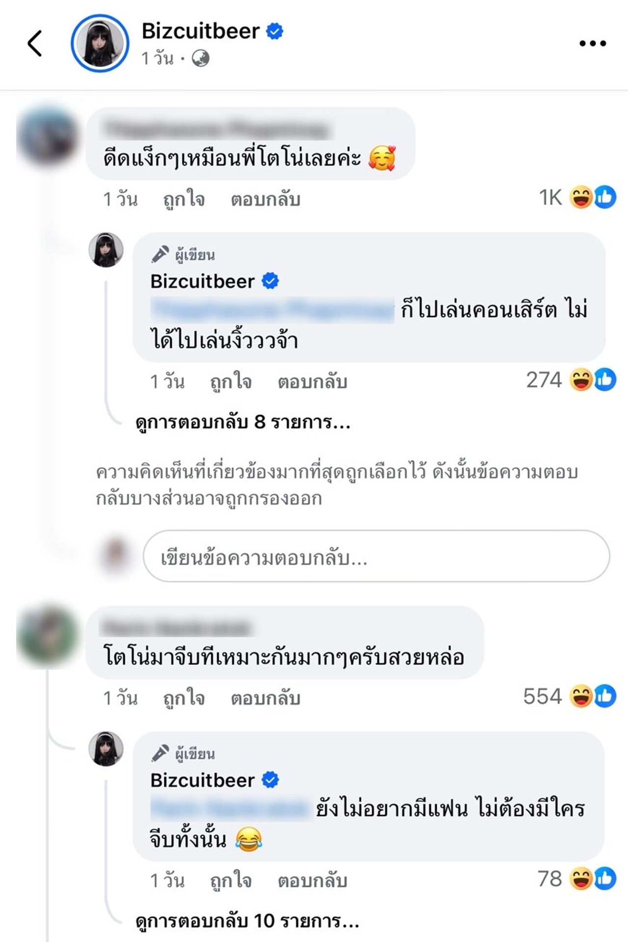 ซึ่งหลังจากที่มีกระแสร้อนดังกล่าว ชาวเน็ตก็เข้าไปคอมเมนต์ในโพสต์ของสาวเบียร์ในแฟนเพจ Bizcuitbeer ไว้ว่า “โตโน่มาจีบทีเหมาะกันมากๆ ครับสวยหล่อ” แต่งานนี้เบียร์ตอบกลับแบบช็อตฟีลทันทีว่า “ยังไม่อยากมีแฟน ไม่ต้องมีใครจีบทั้งนั้น” และใส่อีโมจิขำน้ำตาไหล