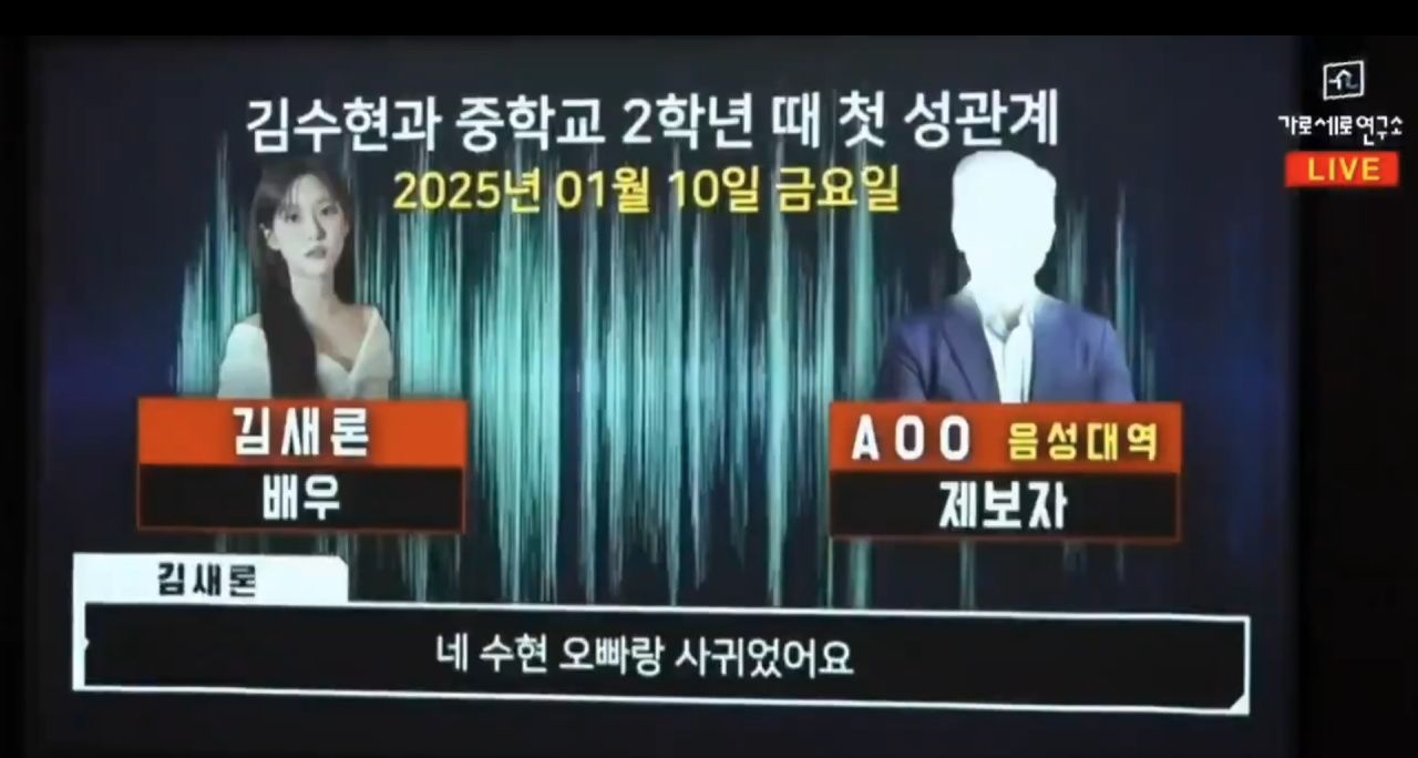 หลังจากที่ทนายความของครอบครัวของ คิมแซรน นักแสดงสาวผู้ล่วงลับ ได้ออกมาตั้งโต๊ะแถลงข่าวอย่างเป็นทางการครั้งที่ 2 พร้อมกับเปิดคลิปเสียงที่อ้างว่าเป็นเสียงของคิมแซรนกับคนรู้จัก ที่ได้พูดถึงความสัมพันธ์ในอดีตกับ คิมซูฮยอน ซึ่งในคลิปนั้น คิมแซรนได้บอกว่าเธอเคยคบหากับคิมซูฮยอนมาตั้งแต่สมัยมัธยมต้น เลิกกันตอนเธอเข้ามหาวิทยาลัย และมีความสัมพันธ์ทางเพศครั้งแรกในช่วงปิดเทอมฤดูหนาวตอนเธออยู่ชั้น ม.2 มีเพียงไม่กี่คนที่รู้ว่าเธอคบกับคิมซูฮยอนตั้งแต่ยังเด็ก