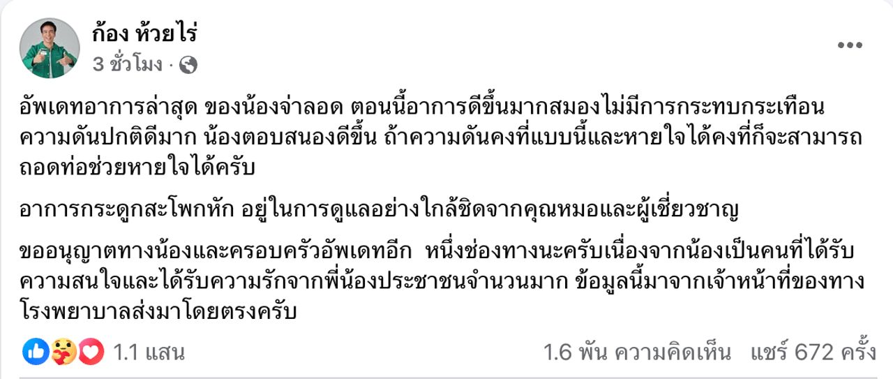 "อัปเดตอาการล่าสุด ของน้องจ่าลอด ตอนนี้อาการดีขึ้นมากสมองไม่มีการกระทบกระเทือน ความดันปกติดีมาก น้องตอบสนองดีขึ้น ถ้าความดันคงที่แบบนี้และหายใจได้คงที่ก็จะสามารถถอดท่อช่วยหายใจได้ครับ