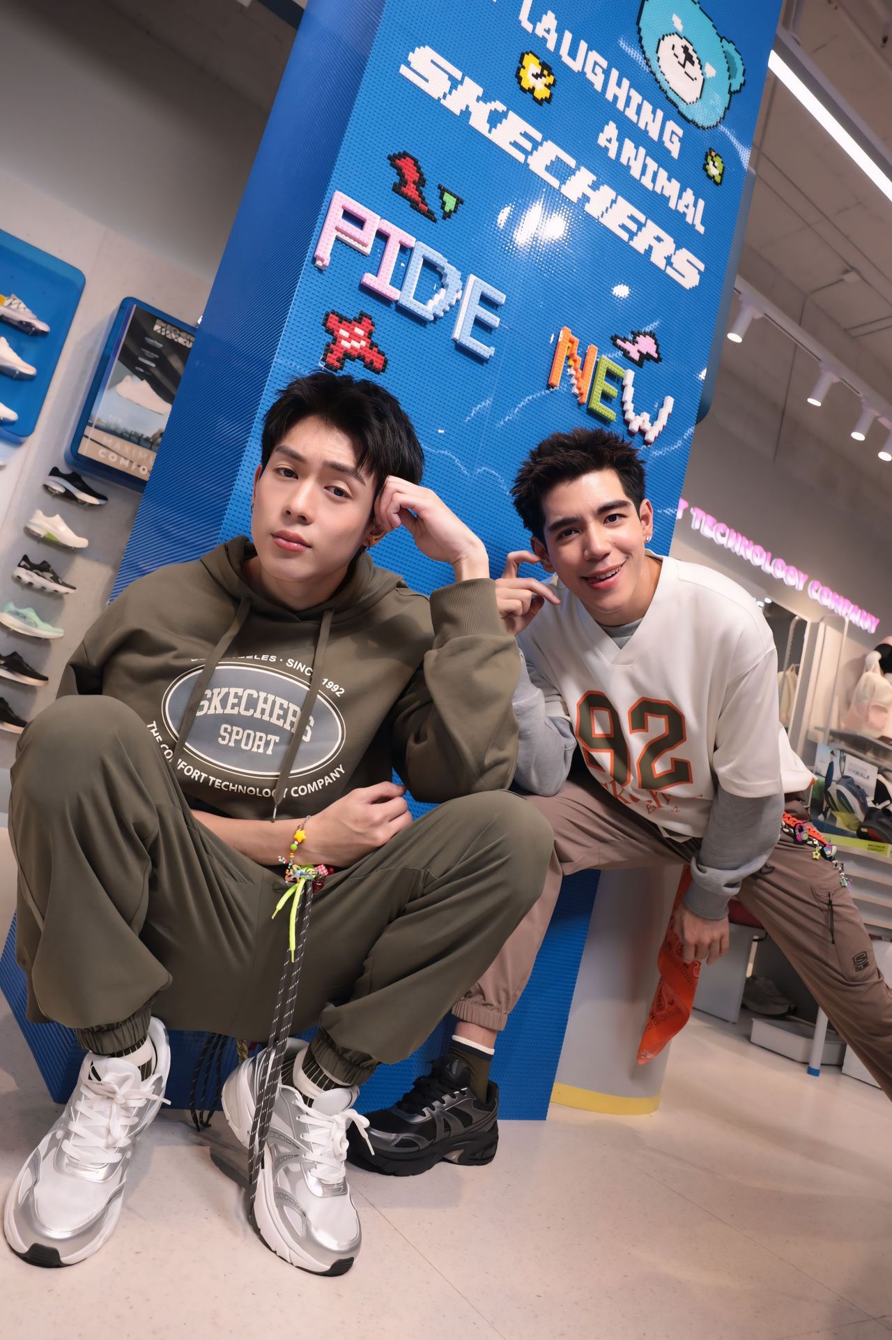 ในขณะที่สองหนุ่ม ไปป์-มนทภูมิ สุมนวรางกูร และ นิว-ชยภัค ตันประยูร ก็ดูโดดเด่นไม่แพ้กัน ไปป์สวมเสื้อยืดแนวเรโทรสปอร์ตพิมพ์ลายตัวเลข 92 ปีที่แบรนด์รองเท้าชื่อก้อง Skechers ได้ถือกำเนิด จับคู่กับกางเกงขายาวสีน้ำตาลสวมใส่สบาย เพิ่มความคูลด้วยกระเป๋าคาดเอวสีดำตัดกัน และสวมสนีกเกอร์สีดำตัดกับแถบสีเงินเมทัลลิก