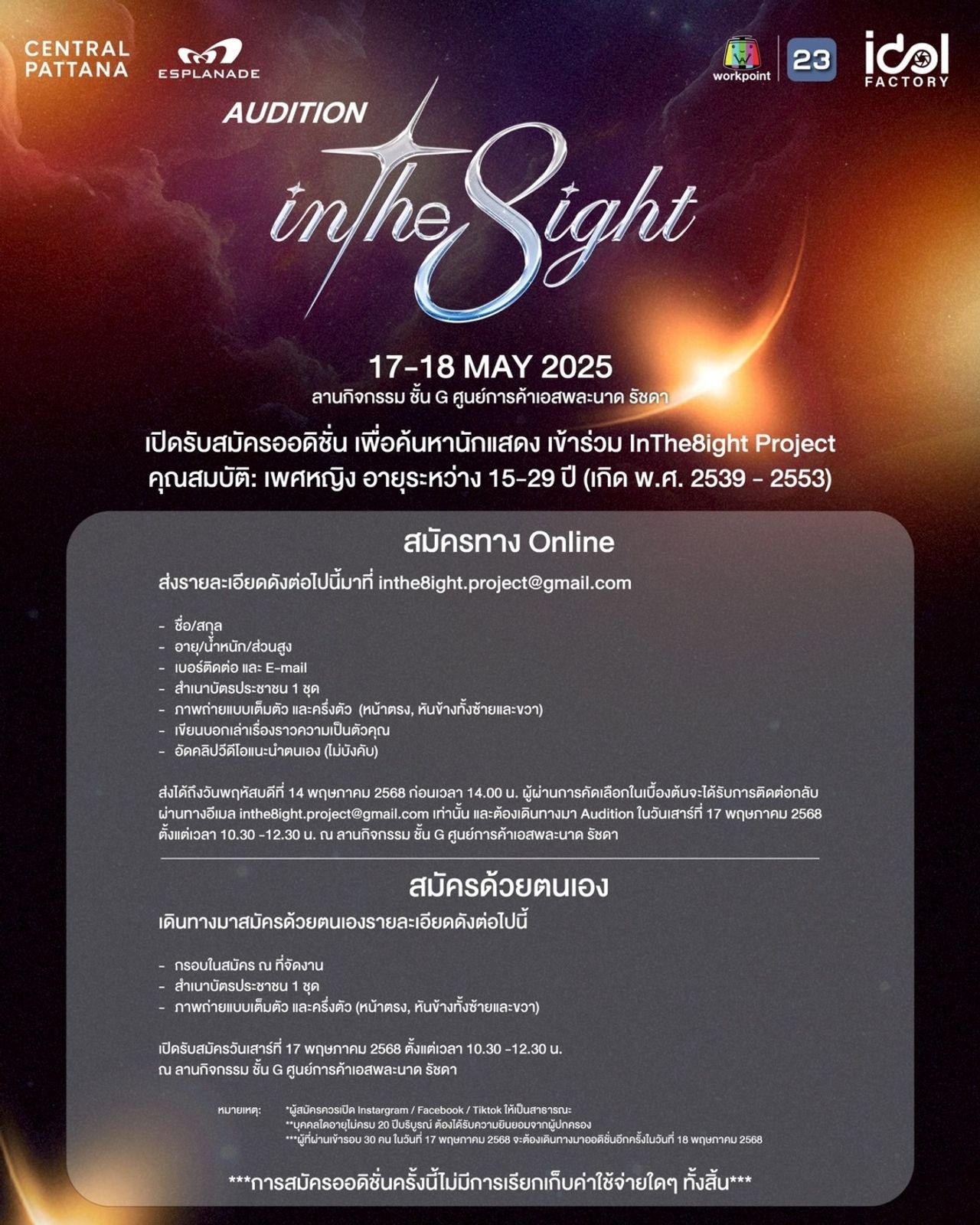 “In The 8ight Project” เปิดเวทีออดิชั่นผู้สมัครเข้าร่วมรายการแล้ววันนี้ ผู้หญิงธรรมดาที่มีฝัน อายุระหว่าง 15-29 ปี (เกิด พ.ศ. 2539 - 2553) อาจเป็นดาวดวงใหม่ พร้อมเซ็นสัญญาเป็นนักแสดงในสังกัด IDOL FACTORY คนต่อไป