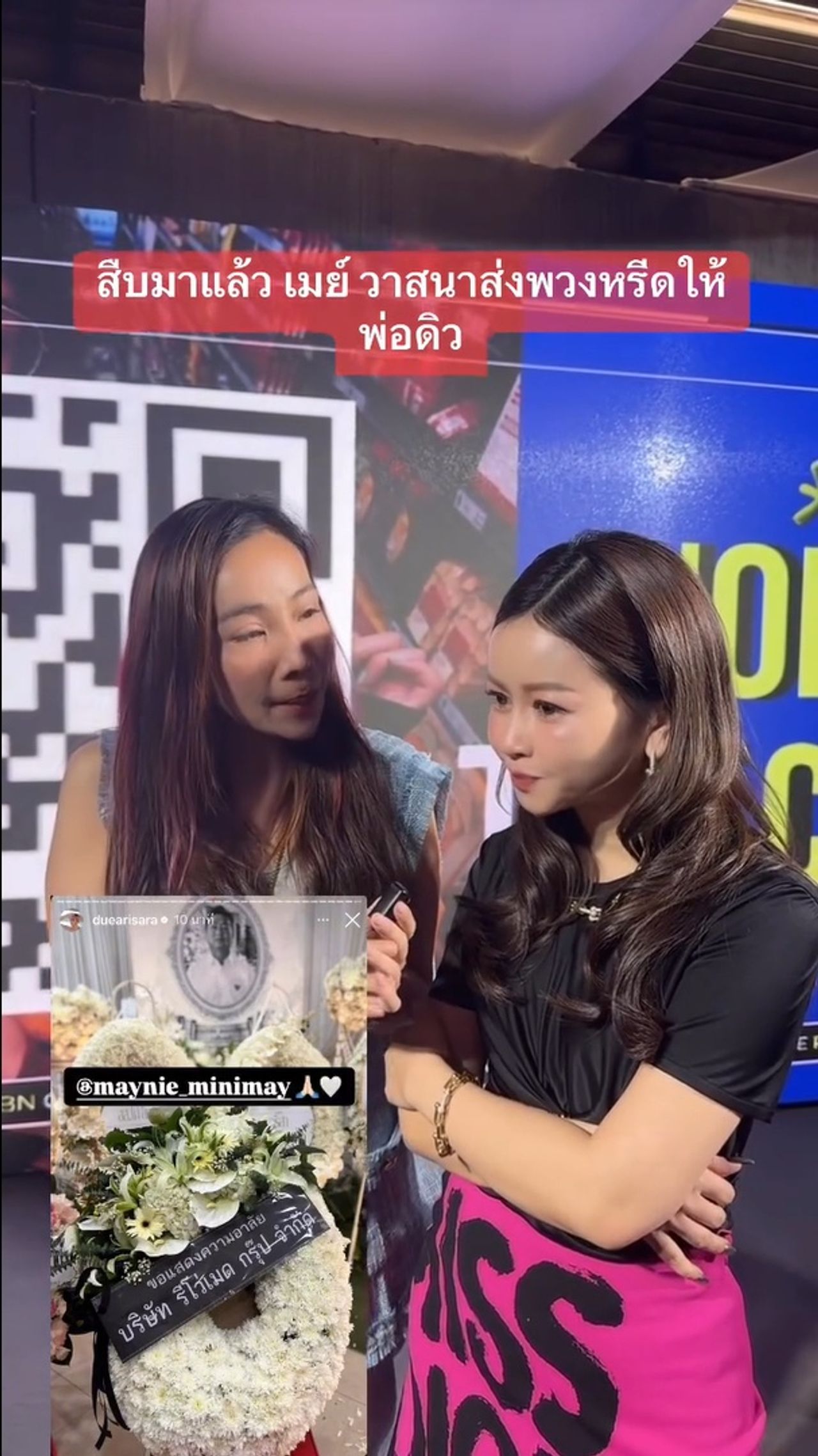 ซึ่งในพิธีศพของคุณพ่อดิวก็มีคนในวงการบันเทิงและคนดังในแวดวงต่างๆ ส่งพวงหรีดมาร่วมแสดงความอาลัยมากมาย หนึ่งในนั้นคือนักธุรกิจสาว เมย์ วาสนา อินทะแสง ที่มีประเด็นเรื่องที่ถูกดิวยืมของไป 62 ล้านบาท ก็ส่งพวงหรีดมาร่วมแสดงความเสียใจ จนกลายเป็นกระแสร้อนในโลกออนไลน์