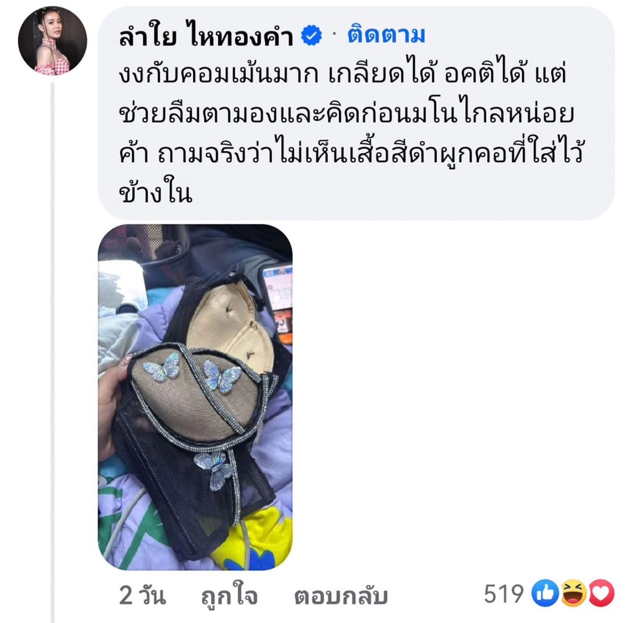 เจอแบบนี้ ลำไย จะไม่ทน เข้ามาคอมเมนต์ตอบกลับว่า "งงกับคอมเม้นมาก เกลียดได้ อคติได้ แต่ช่วยลืมตามองและคิดก่อนมโนไกลหน่อยค้า ถามจริงว่าไม่เห็นเสื้อสีดำผูกคอที่ใส่ไว้ข้างใน" พร้อมปารูปชุดที่ถูกวิจารณ์ในคอมเมนต์ดังกล่าวให้คนได้เห็นอีกด้วยว่าจริงๆ ชุดนั้นเป็นแบบไหน