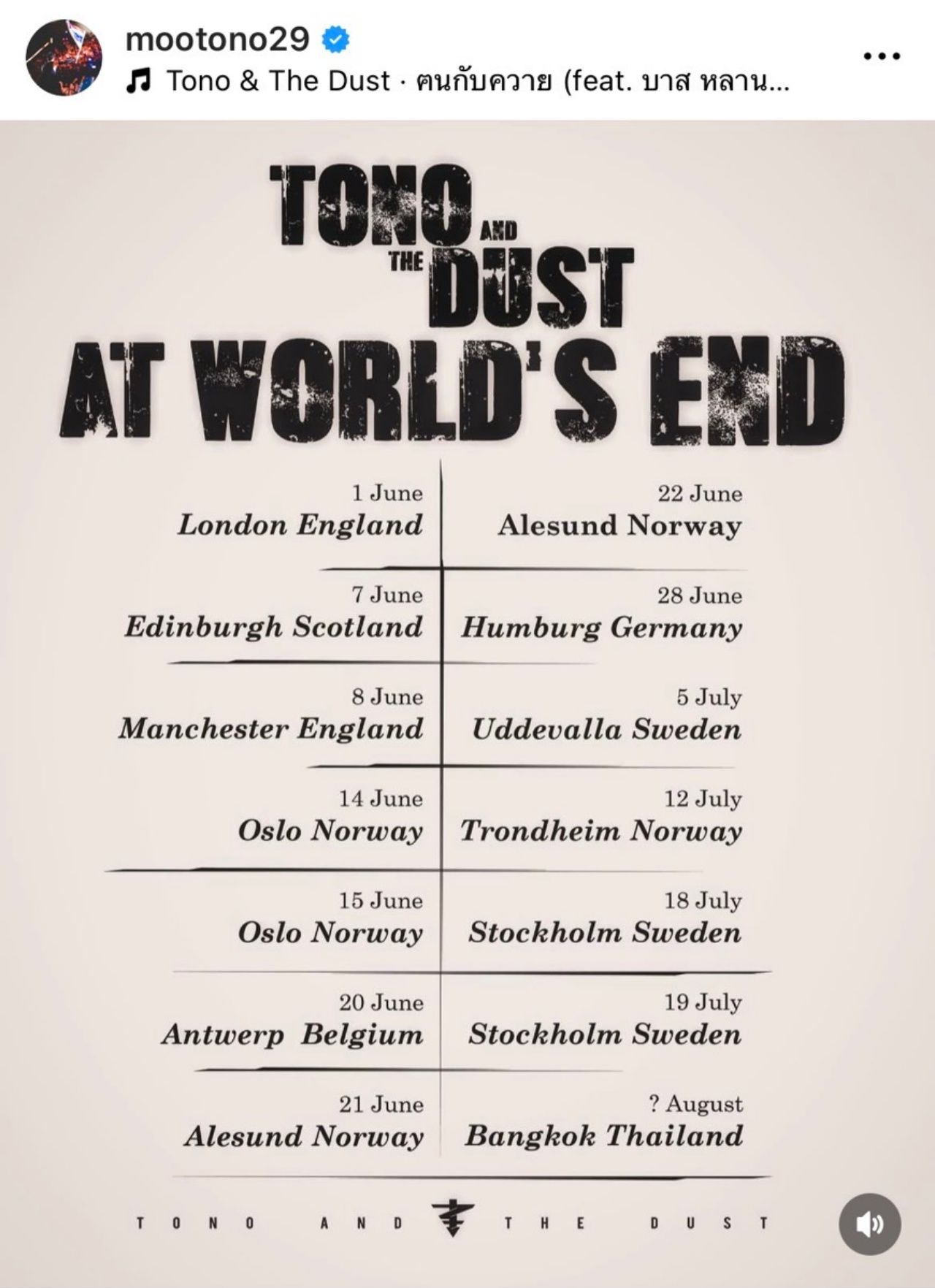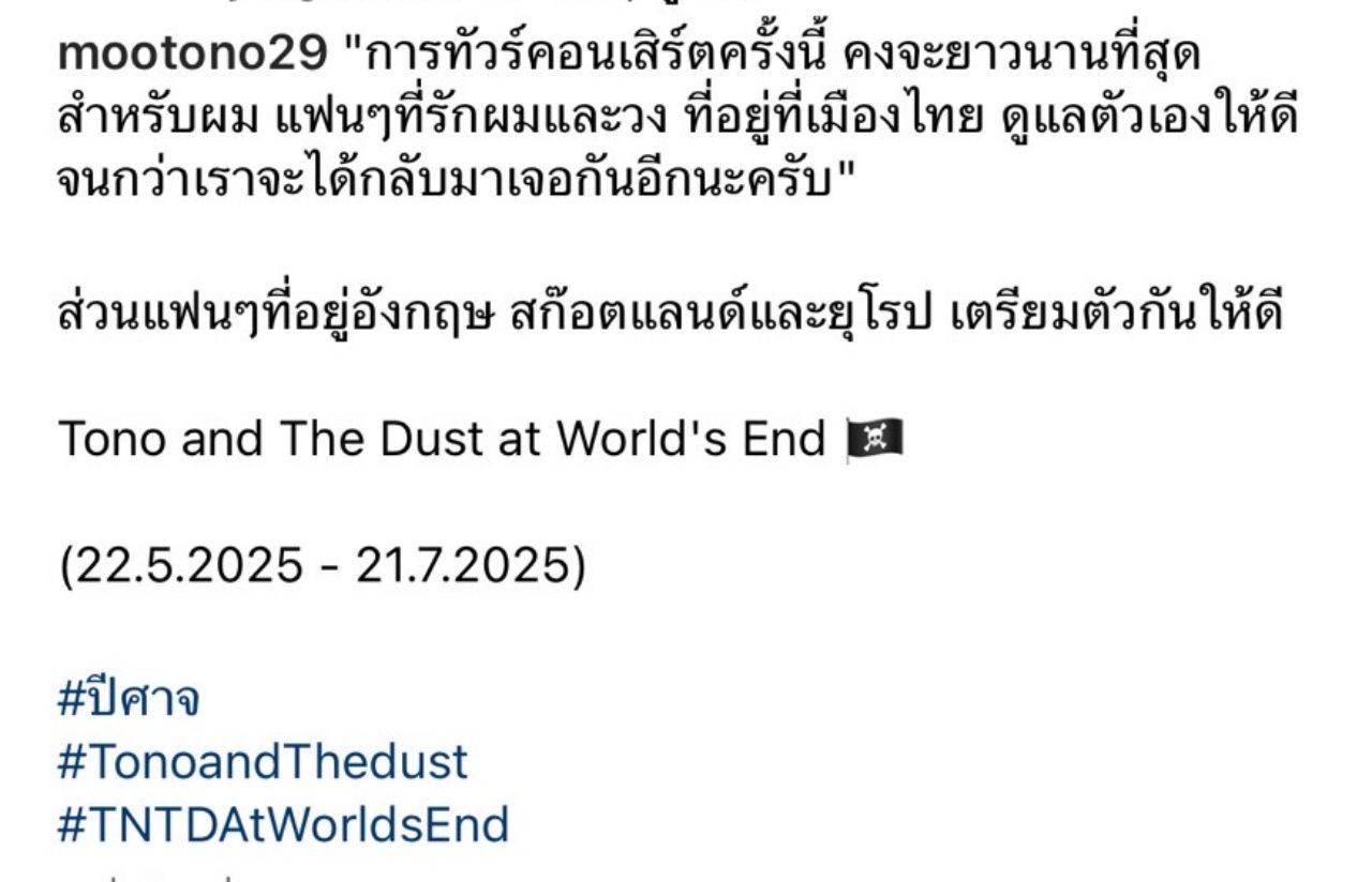 "การทัวร์คอนเสิร์ตครั้งนี้คงจะยาวนานที่สุดสำหรับผม แฟนๆ ที่รักผมและวงที่อยู่ที่เมืองไทย ดูแลตัวเองให้ดีจนกว่าเราจะได้กลับมาเจอกันอีกนะครับ ส่วนแฟนๆ ที่อยู่อังกฤษ สกอตแลนด์ และยุโรป เตรียมตัวกันให้ดี Tono and The Dust at World's End (22.5.2025 - 21.7.2025)"