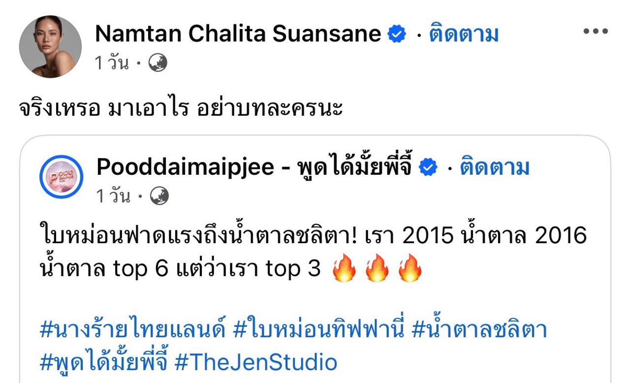 จากกรณีที่ ใบหม่อน ทิฟฟานี่ โพสต์แซะ น้ำตาล ชลิตา และยังบอกว่าตัวเองนั้นปี 2015 ส่วนน้ำตาลปี 2016 น้ำตาล top 6 แต่ว่าตัวเอง top 3