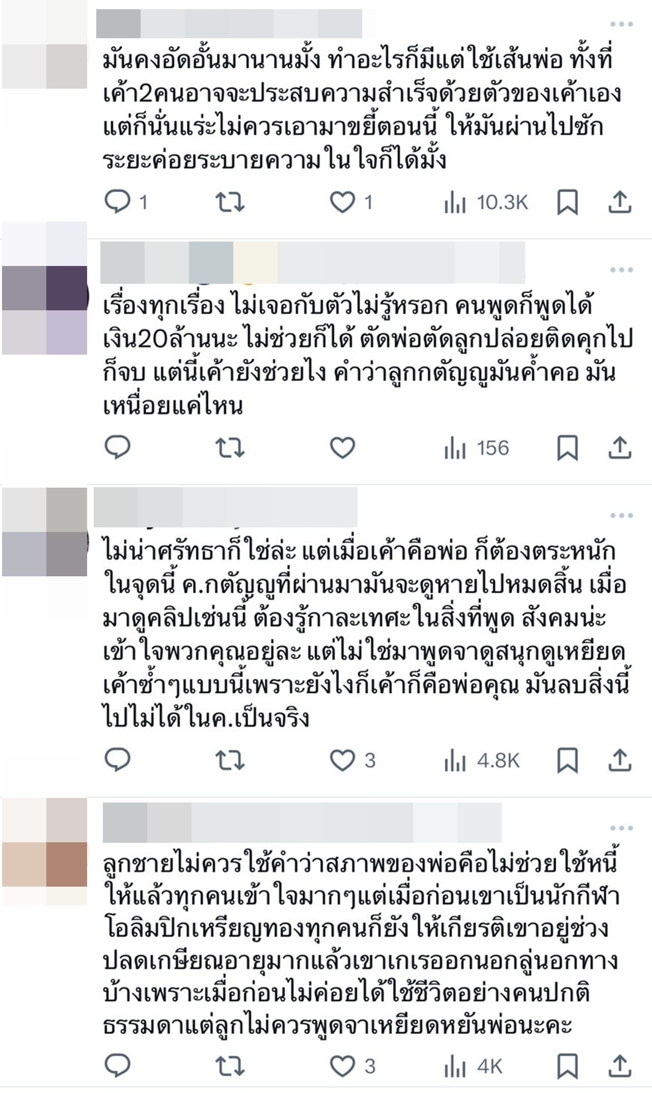 - ลูกชายไม่ควรใช้คำว่าสภาพของพ่อ คือไม่ช่วยใช้หนี้ให้แล้ว ทุกคนเข้าใจมากๆ แต่เมื่อก่อนเขาเป็นนักกีฬาโอลิมปิกเหรียญทอง ทุกคนยังต้องให้เกียรติเขาอยู่ ช่วงปลดเกษียณอายุมากแล้ว เขาเกเรออกนอกลู่นอกทางบ้าง เพราะเมื่อก่อนไม่ค่อยได้ใช้ชีวิตอย่างคนปกติธรรมดา แต่ลูกไม่ควรพูดจาเหยียดหยันพ่อนะคะ
