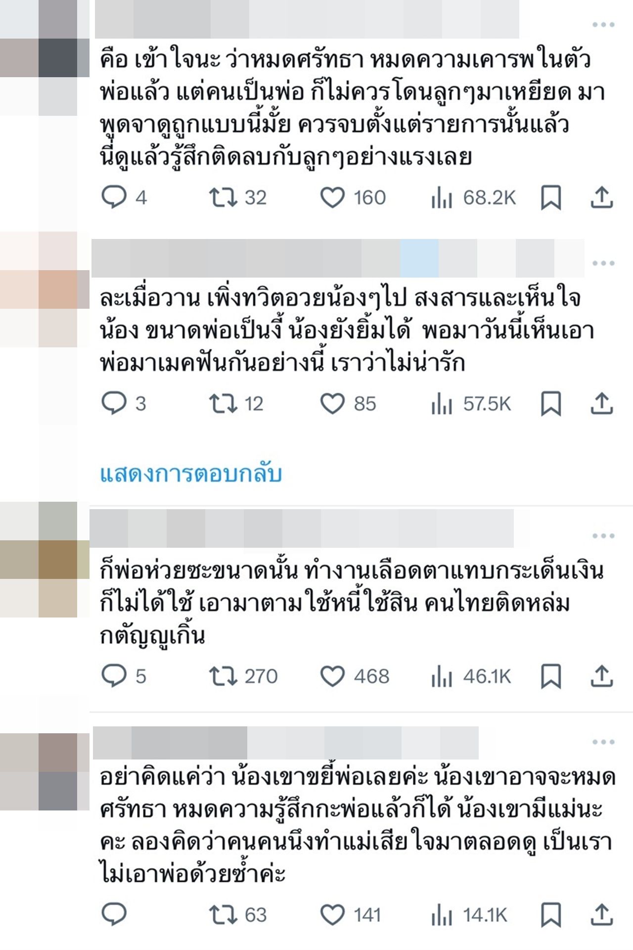 - คือ เข้าใจนะ ว่าหมดศรัทธา หมดความเคารพในตัวพ่อแล้ว แต่คนเป็นพ่อ ก็ไม่ควรโดนลูกๆมาเหยียด มาพูดจาดูถูกแบบนี้มั้ย ควรจบตั้งแต่รายการนั้นแล้ว นี่ดูแล้วรู้สึกติดลบกับลูกๆอย่างแรงเลย