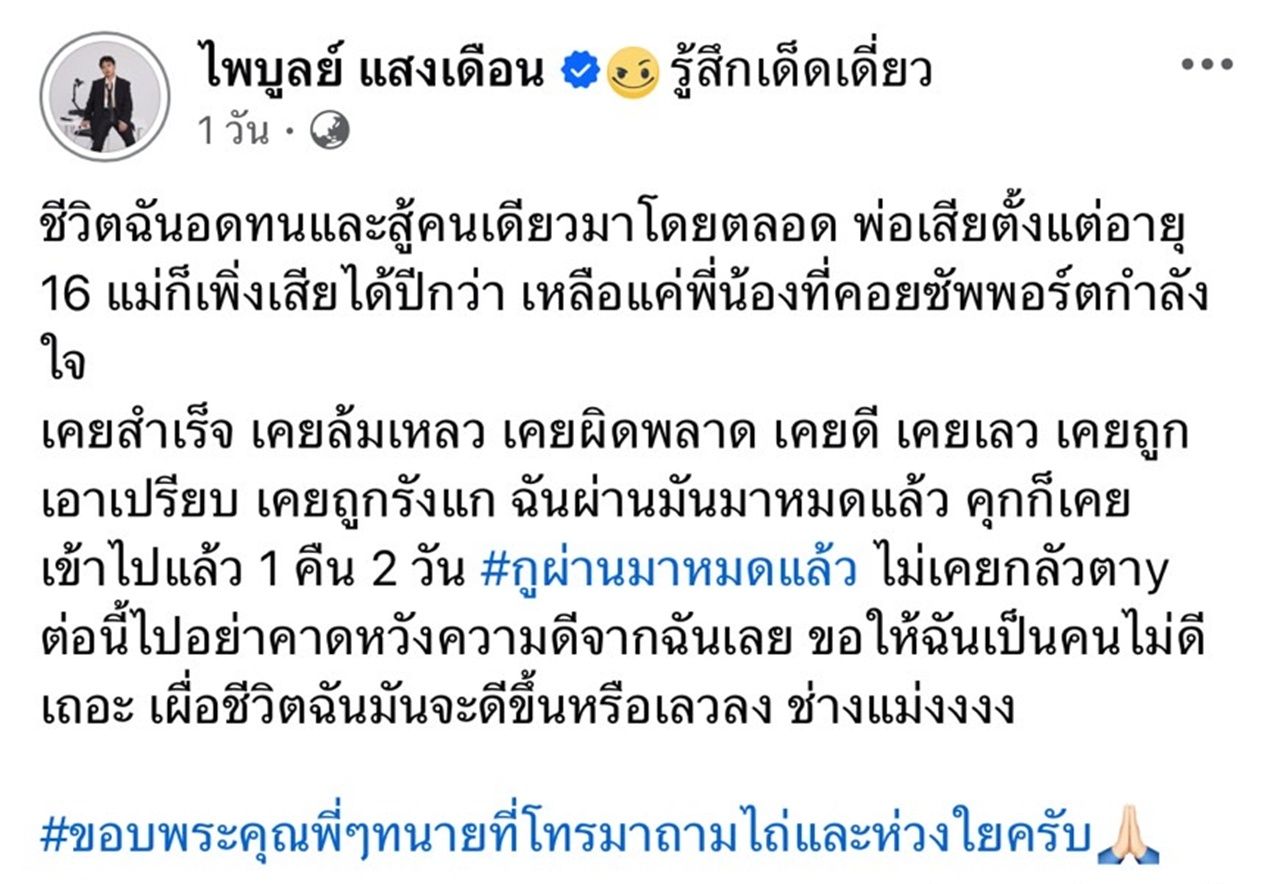 เคยสำเร็จ เคยล้มเหลว เคยผิดพลาด เคยดี เคยเลว เคยถูกเอาเปรียบ เคยถูกรังแก ฉันผ่านมันมาหมดแล้ว คุกก็เคยเข้าไปแล้ว 1 คืน 2 วัน #กูผ่านมาหมดแล้ว ไม่เคยกลัวตาย ต่อนี้ไปอย่าคาดหวังความดีจากฉันเลย ขอให้ฉันเป็นคนไม่ดีเถอะ เผื่อชีวิตฉันมันจะดีขึ้นหรือเลวลง ช่างแม่งงงง #ขอบพระคุณพี่ๆ ทนายที่โทรมาถามไถ่และห่วงใยครับ"