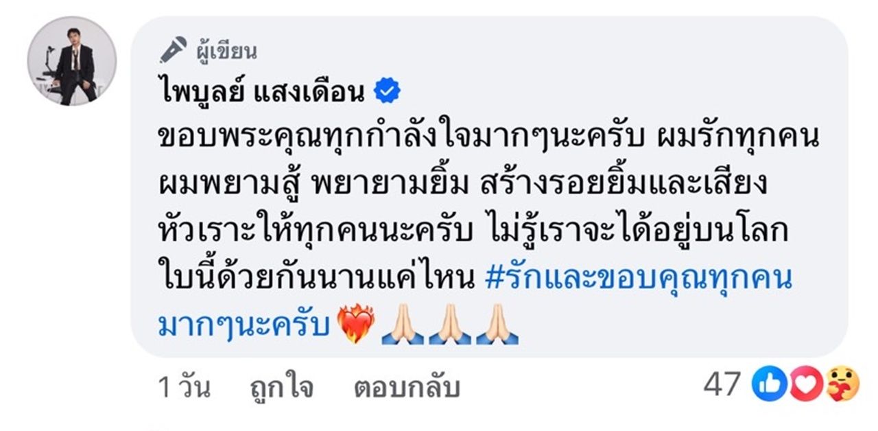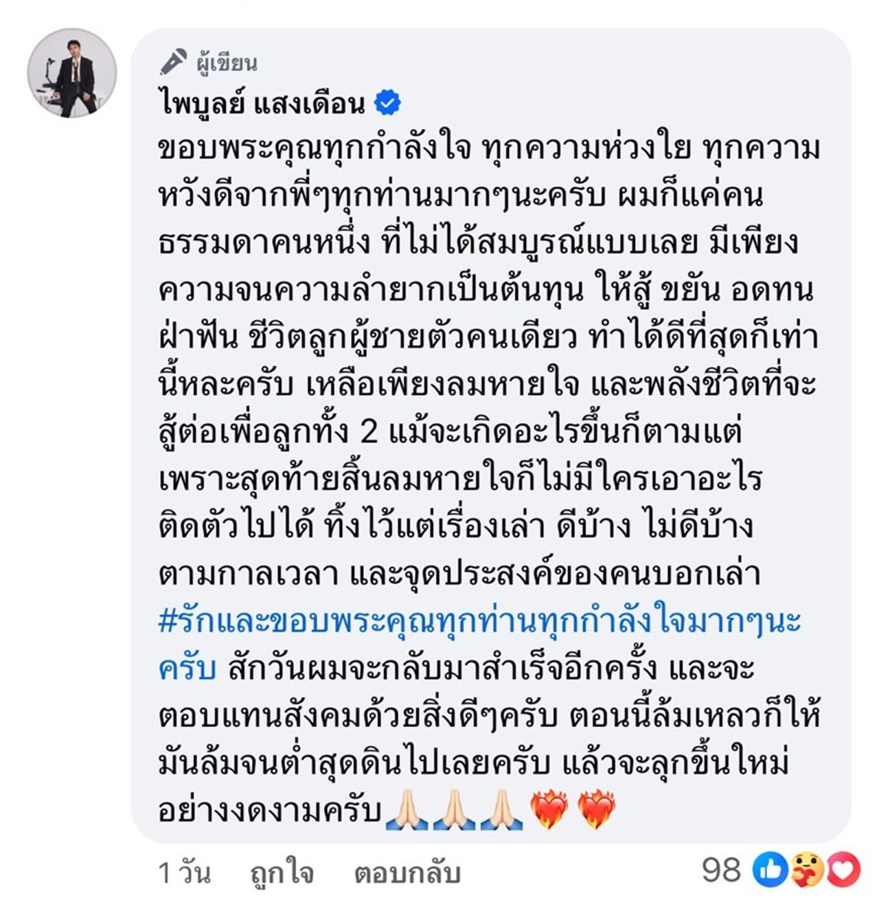ก่อนจะโพสต์เพิ่มเติมในคอมเมนต์ขอบคุณทุกความห่วงใยที่ส่งให้ "ขอบพระคุณทุกกำลังใจ ทุกความห่วงใย ทุกความหวังดีจากพี่ๆ ทุกท่านมากๆ นะครับ ผมก็แค่คนธรรมดาคนหนึ่ง ที่ไม่ได้สมบูรณ์แบบเลย มีเพียงความจนความลำบากเป็นต้นทุน ให้สู้ ขยัน อดทน ฝ่าฟัน ชีวิตลูกผู้ชายตัวคนเดียว ทำได้ดีที่สุดก็เท่านี้ละครับ เหลือเพียงลมหายใจ