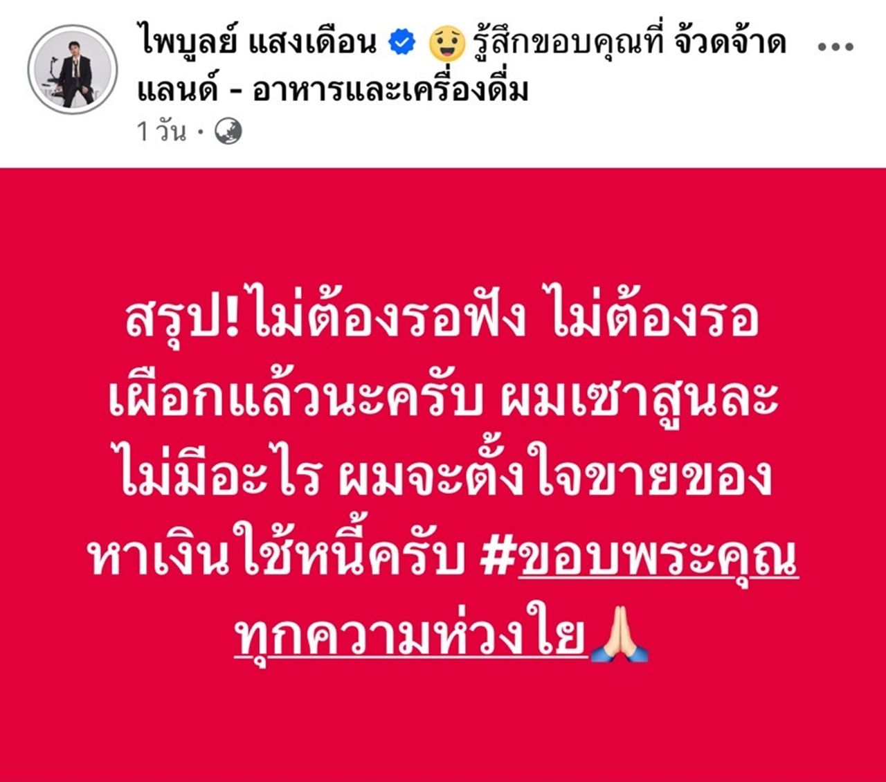 จนกระทั่งล่าสุดเจ้าตัวได้บอกว่า "สรุป! ไม่ต้องรอฟัง ไม่ต้องรอเผือกแล้วนะครับ ผมเซาสูนละ ไม่มีอะไร ผมจะตั้งใจขายของ หาเงินใช้หนี้ครับ #ขอบพระคุณทุกความห่วงใย"