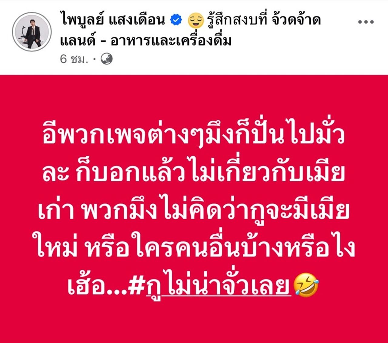 ทำเอาหลายคนต่างสงสัยหลังเห็น ครูไพบูลย์ แสงเดือน โพสต์ข้อความสุดเดือด พร้อมระบายความในใจแบบร่ายยาว จนทำเอาหลายคนต่างเป็นห่วงว่าเกิดอะไรขึ้นกับครูไพบูลย์อีก และพร้อมใจเข้ามาใส่ใจกันยกใหญ่ หลังเห็นเจ้าตัวโพสต์ร่ายยาวความในใจ บอกว่า