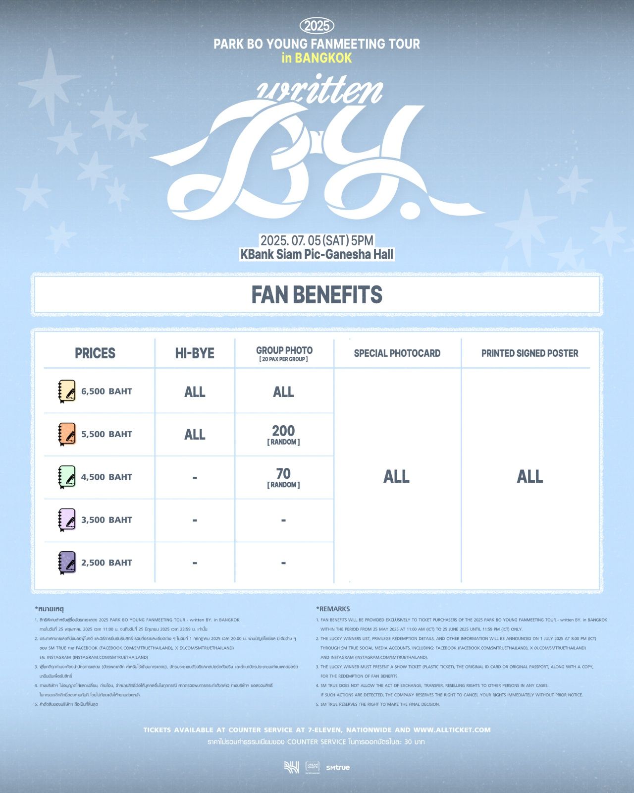 เตรียมบันทึกช่วงเวลาแสนอบอุ่นหัวใจ ท่ามกลางบรรยากาศสุดพิเศษ กับแฟนมีตติ้งครั้งแรกของเธอในประเทศไทยที่จะเติมเต็มทุกความคิดถึงใน 2025 PARK BO YOUNG FANMEETING TOUR - written BY. in BANGKOK เปิดจำหน่ายบัตรอย่างเป็นทางการ ในวันอาทิตย์ที่ 25 พฤษภาคม 2025 ตั้งแต่เวลา 11:00 น. เป็นต้นไป ทางเคาน์เตอร์เซอร์วิสในร้าน 7-Eleven ทุกสาขาทั่วประเทศ และทางเว็บไซต์ allticket บัตรนั่งราคา 6,500 / 5,500 / 4,500 / 3,500 / 2,500 บาท พร้อมสิทธิพิเศษสำหรับผู้ซื้อบัตร