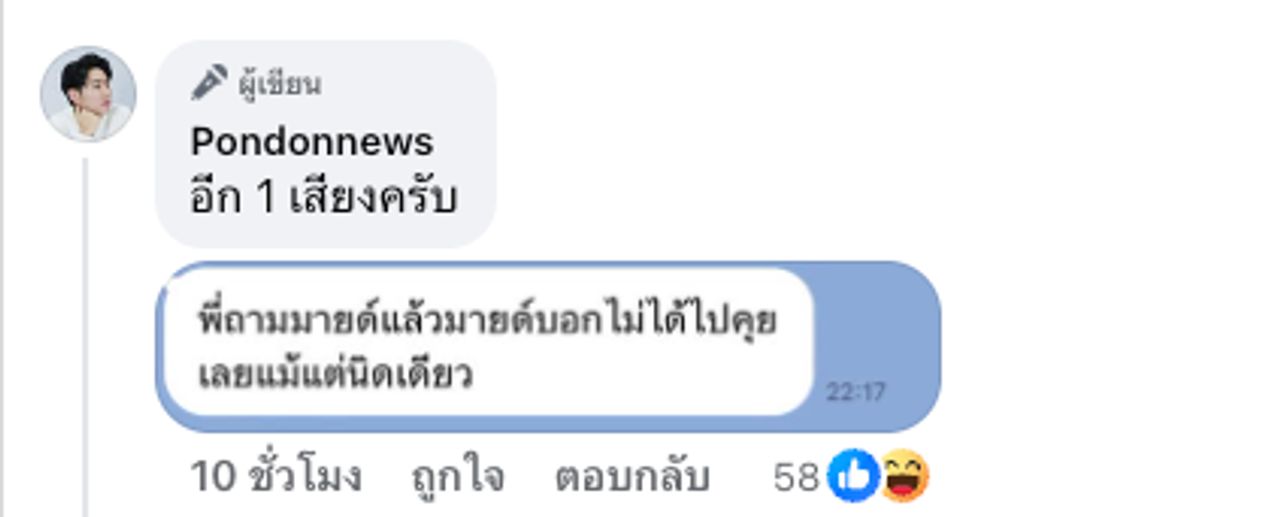 และเพจ Pondonnews ก็ได้คอมเมนต์ต่อว่า "อีก 1 เสียงครับ" พร้อมแคปรูปเป็นการคุยกันว่า "พี่ถามมายด์แล้ว มายด์บอกไม่ได้ไปคุยเลยแม้แต่นิดเดียว" แต่ถึงจะมีแชตหลักฐาน ก็ยังมีชาวเน็ตที่ยังไม่ปักใจเชื่อร้อยเปอร์เซนต์ พร้อมกับตั้งคำถามว่า ถ้าเป็นเกเก้จริงแล้วลบทำไม