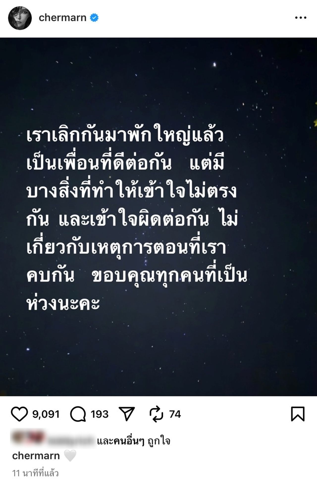 และล่าสุด พลอย เฌอมาลย์ โพสต์ข้อความชี้แจงถึงความสัมพันธ์กับ โต้ง ทูพี ว่าเลิกกันพักใหญ่แล้ว แต่มีบางอย่างที่ทำให้เข้าใจผิดกัน ไม่เกี่ยวกับเหตุการณ์ตอนที่คบกัน โดยบอกว่า “เราเลิกกันมาพักใหญ่แล้ว เป็นเพื่อนที่ดีต่อกัน แต่มีบางสิ่งที่ทําให้เข้าใจไม่ตรงกัน และเข้าใจผิดต่อกัน ไม่เกี่ยวกับเหตุการณ์ตอนที่เราคบกัน ขอบคุณทุกคนที่เป็นห่วงนะคะ”