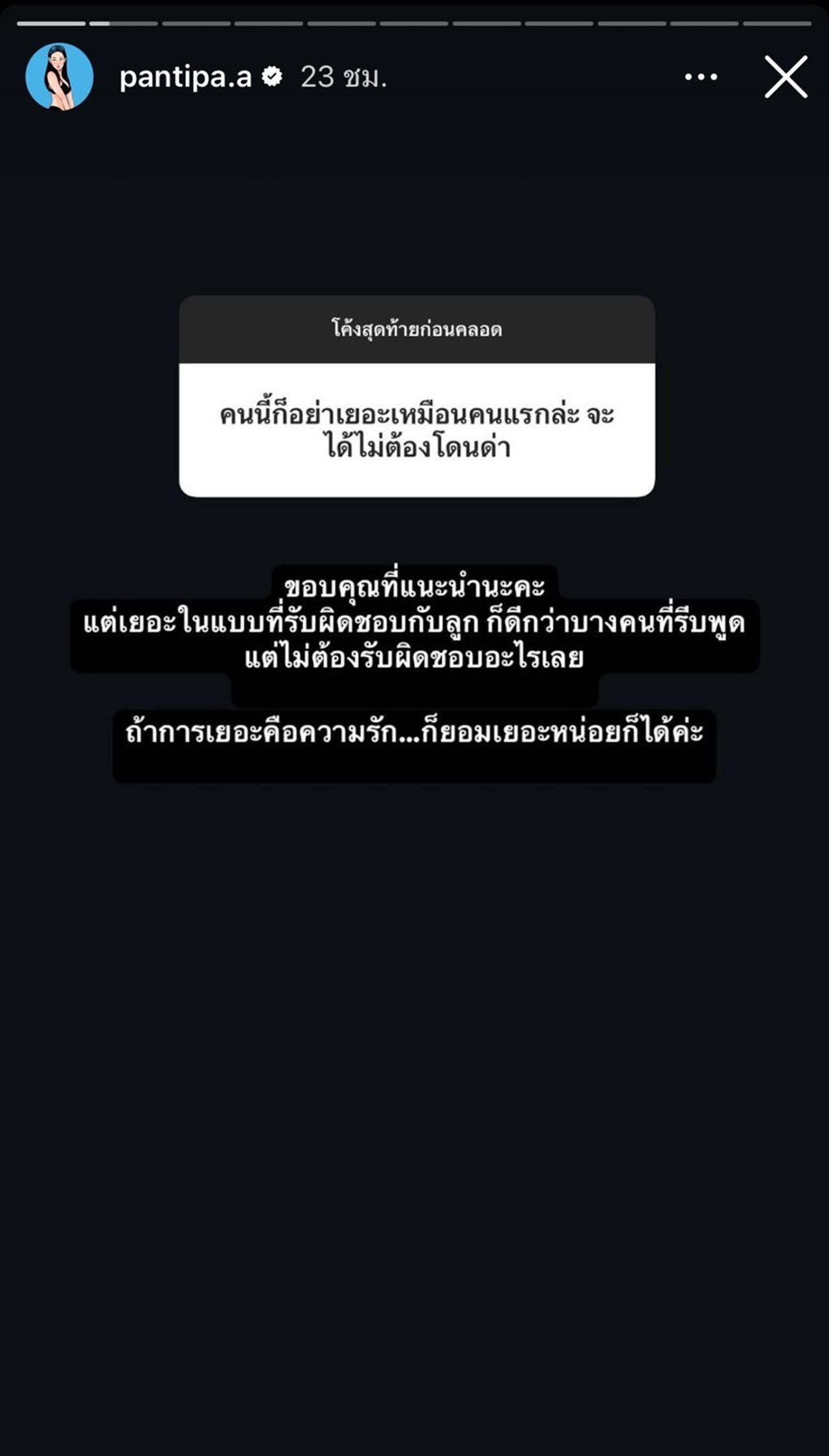 ด้านแม่ปุ้มปุ้ยก็ตอบกลับว่า "ขอบคุณที่แนะนำนะคะ แต่เยอะในแบบที่รับผิดชอบกับลูก ก็ดีกว่าบางคนที่รีบพูด แต่ไม่ต้องรับผิดชอบอะไรเลย ถ้าการเยอะคือความรัก...ก็ยอมเยอะหน่อยก็ได้ค่ะ"
