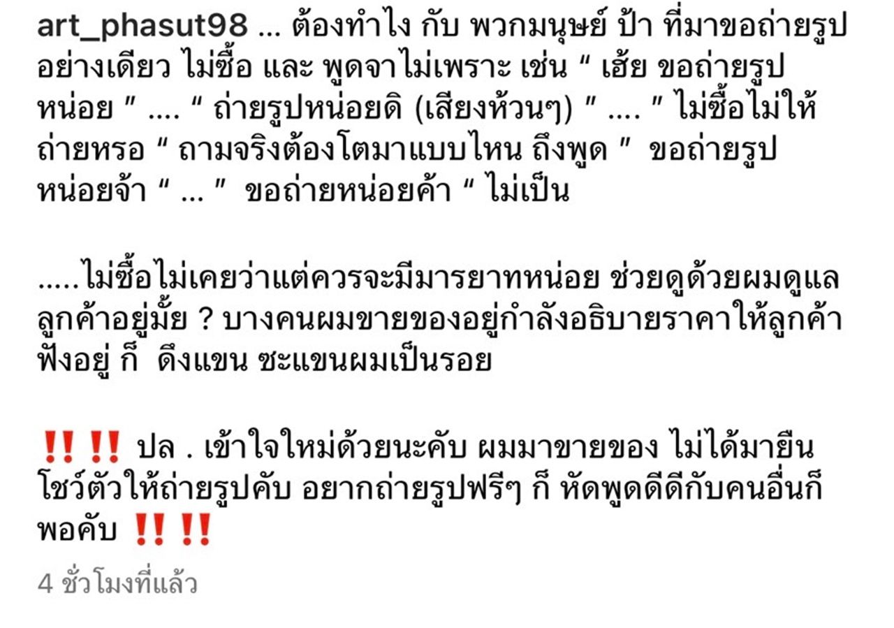 ปล. เข้าใจใหม่ด้วยนะครับ ผมมาขายของ ไม่ได้มายืนโชว์ตัวให้ถ่ายรูปครับ อยากถ่ายรูปฟรี ๆ ก็หัดพูดดี ๆ กับคนอื่นก็พอครับ"