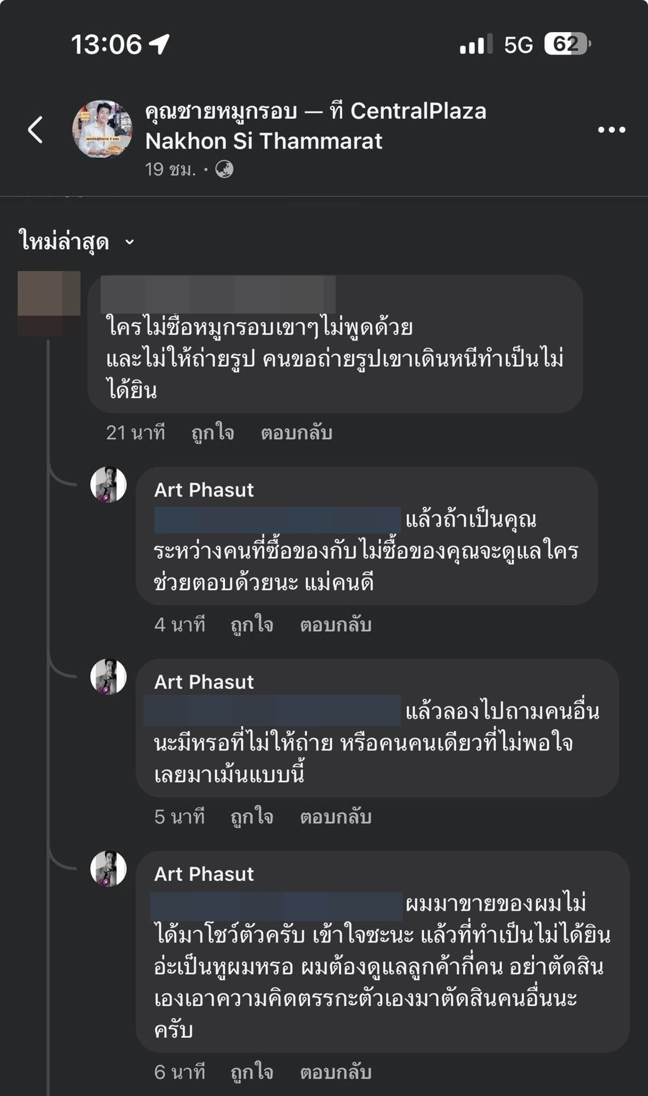 "ใครไม่ซื้อหมูกรอบเขา เขาไม่พูดด้วย และไม่ให้ถ่ายรูป คนขอถ่ายรูป เขาเดินหนีทำเป็นไม่ได้ยิน" ซึ่งอาร์ตก็ไม่ปล่อยผ่าน ได้เข้าไปตอบกลับว่า "แล้วถ้าเป็นคุณ ระหว่างคนที่ซื้อของกับไม่ซื้อของ คุณจะดูแลใคร ช่วยตอบด้วยนะ แม่คนดี", "แล้วลองไปถามคนอื่นนะ มีหรอที่ไม่ให้ถ่าย หรือคนคนเดียวที่ไม่พอใจเลยมาเมนต์แบบนี้" และ "ผมมาขายของผมไม่ได้มาโชว์ตัวครับ เข้าใจซะนะ แล้วที่ทำเป็นไม่ได้ยินอ่ะเป็นหูผมหรอ ผมต้องดูแลลูกค้ากี่คน อย่าตัดสินเองเอาความคิดตรรกะตัวเองมาตัดสินคนอื่นนะครับ"