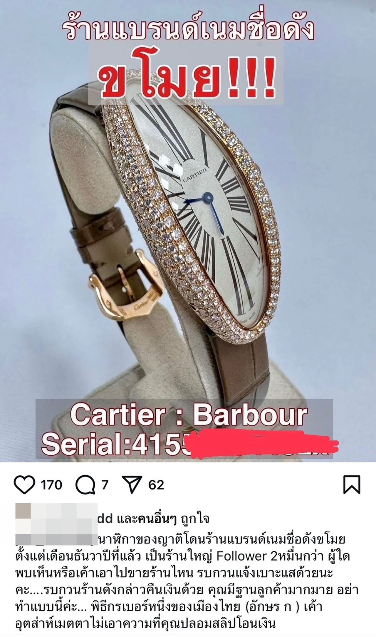พี่ไม่รู้เรื่องไง มันจะเป็นนาฬิกา พี่ไม่รู้เรื่องเลยจริงๆ เรื่องที่พี่รู้คือ พี่แค่ซื้อของร้านๆ หนึ่ง ก็คือไปเอาของจากอีกที่มา แต่พี่ไม่รู้ พี่ไม่เกี่ยวไง พี่ซื้อร้านนี้ ส่วนร้านนี้จะไปมีปัญหากับอีกที่หนึ่งก็เป็นส่วนของเขาแต่อีกร้านดันเอาชื่อพี่ไปพูดพี่ไม่ชอบตรงนี้