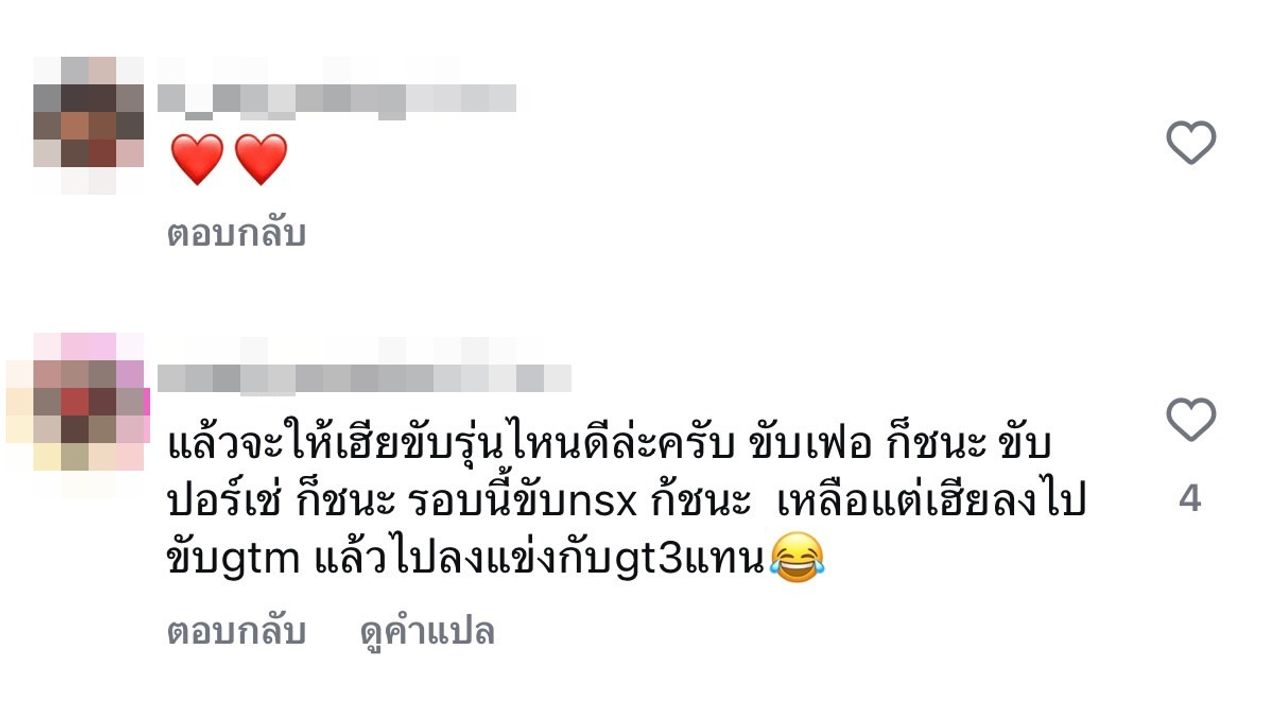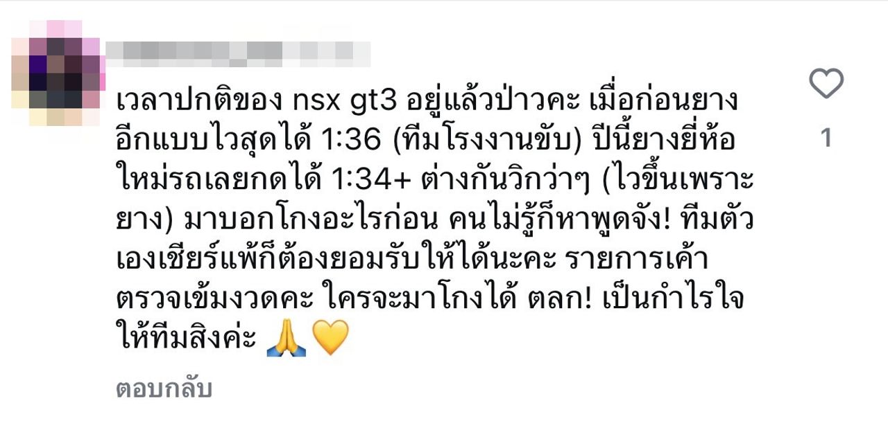 มันมีแบบนี้ด้วยหรอครับ ปีนั้นที่มีเบนซ์มาแข่ง ผมดู ผมรู้สึกว่ารถตัวนั้นโกงกว่าได้เลยครับ, แล้วจะให้เฮียขับรุ่นไหนดีล่ะครับ ขับเฟอ ก็ชนะ ขับปอร์เช่ ก็ชนะ รอบนี้ขับ nsx ก็ชนะ เหลือแต่เฮียลงไปขับ gtm แล้วไปลงแข่งกับ gt3 แทน, ได้ไปเชียร์คุณต๊อดด้วยค่ะ รถคุณต๊อดเร็วจริงค่ะ เป็นกำลังใจให้ค่ะ"