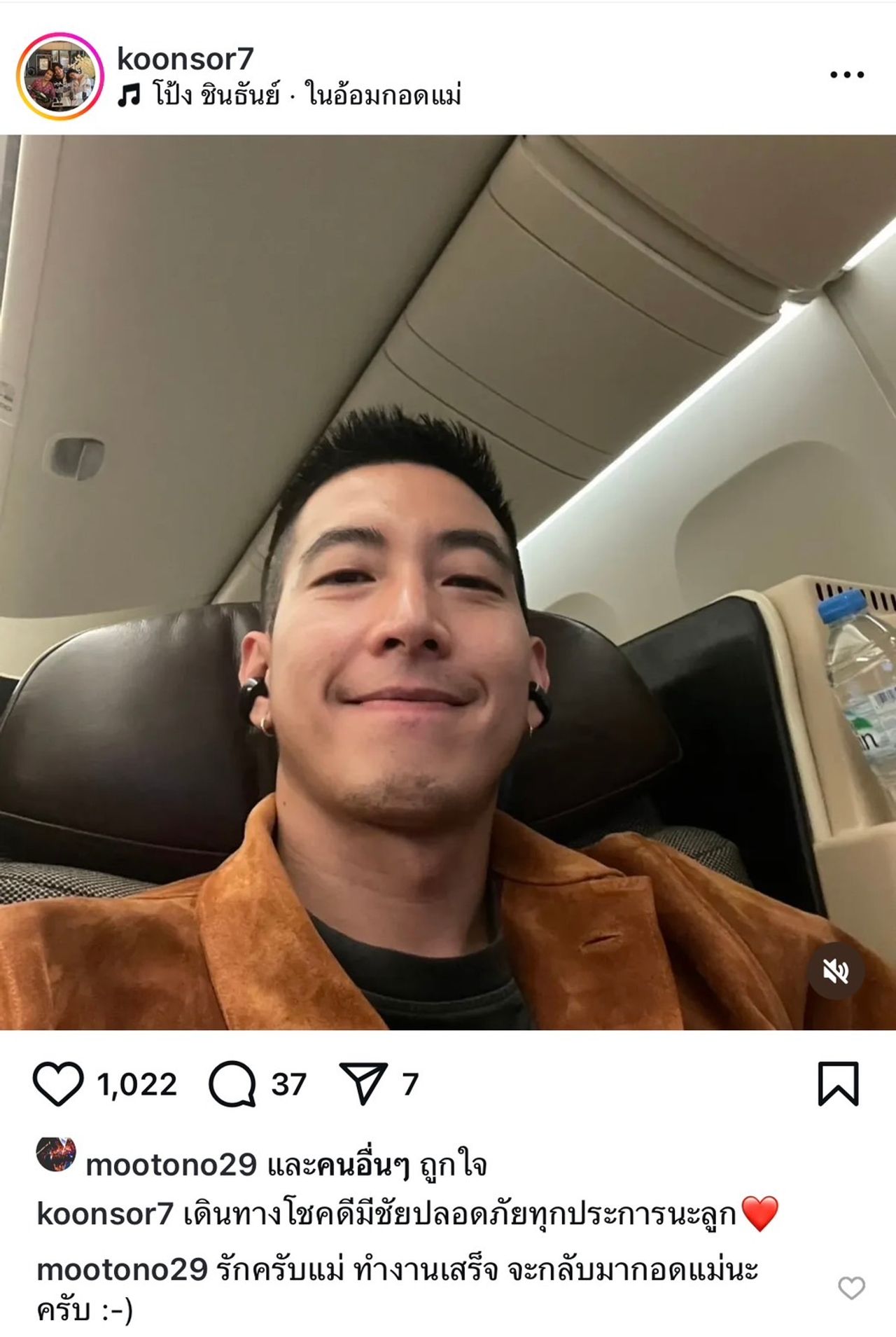 งานนี้ คุณแม่น้อย สุดลมโชย ก็ได้โพสต์รูปลูกชายสุดที่รักพร้อมกับเขียนแคปชั่นเอาไว้ว่า "เดินทางโชคดีมีชัยปลอดภัยทุกประการนะลูก" ซึ่งโตโน่ก็ได้คอมเมนต์ตอบกลับคุณแม่ว่า "รักครับแม่ ทำงานเสร็จ จะกลับมากอดแม่นะครับ :-)" ซึ่งคุณแม่น้อยก็ได้โพสต์รูปอีโมจิหัวใจสีแดงตอบกลับลูกชายอีกด้วย