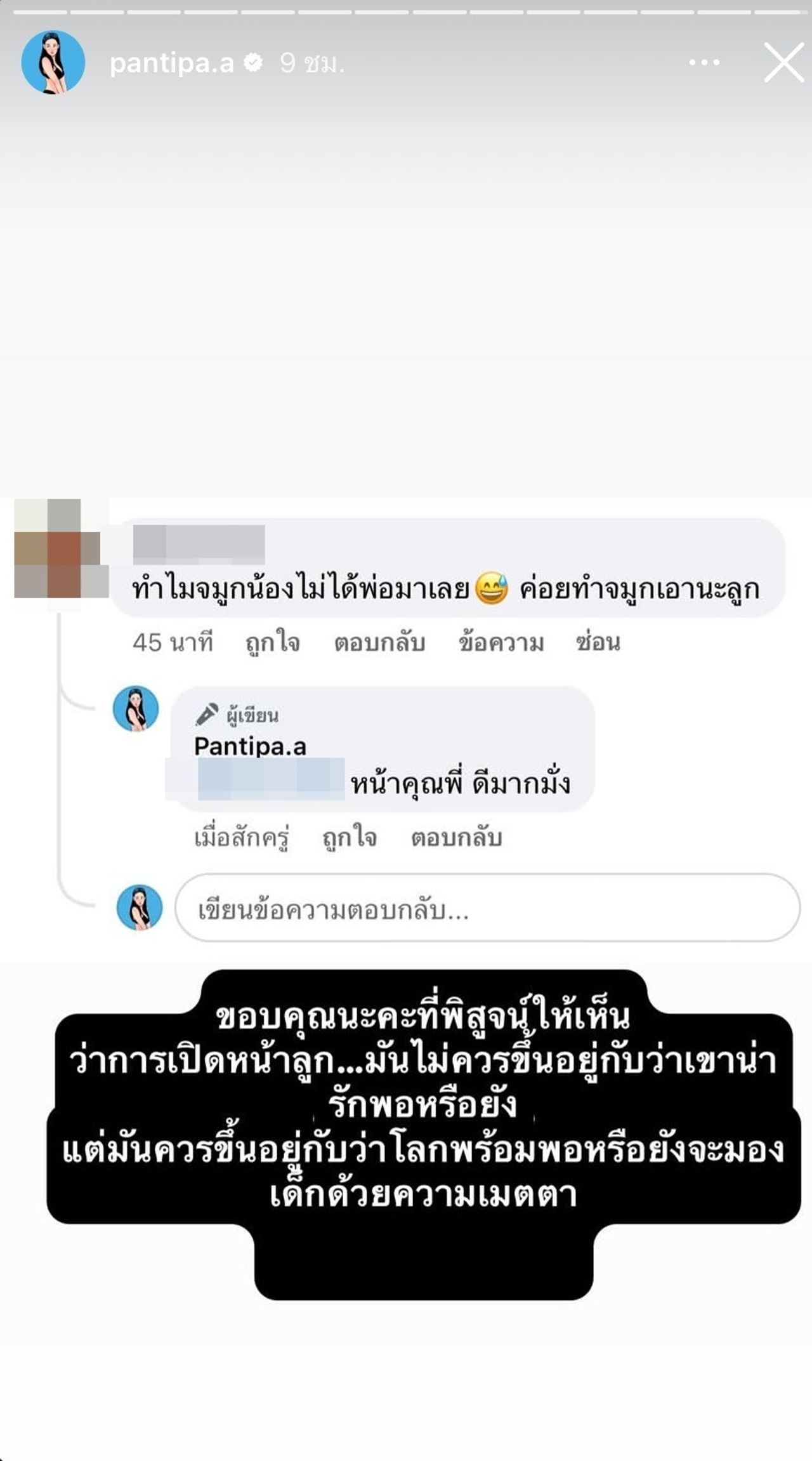 พร้อมกับเอาไปโพสต์ในไอจีสตอรี่ และเขียนข้อความสอนชาวเน็ตบางคนเอาไว้ว่า "ขอบคุณนะคะที่พิสูจน์ให้เห็นว่าการเปิดหน้าลูก...มันไม่ควรขึ้นอยู่กับว่าเขาน่ารักพอหรือยัง แต่มันควรขึ้นอยู่กับว่า โลกพร้อมพอหรือยังจะมองเด็กด้วยความเมตตา"