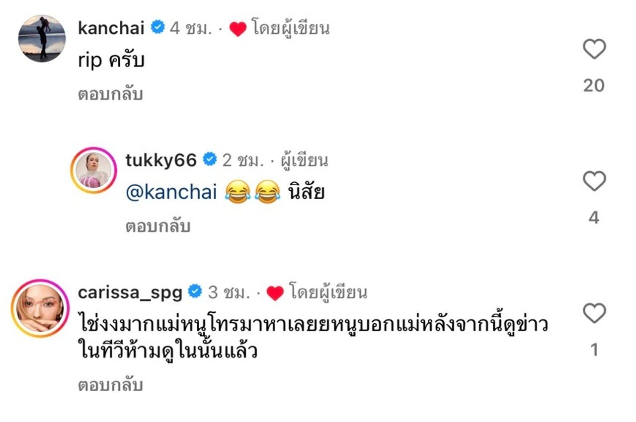 แต่งานนี้พิธีกรรุ่นพี่คนดังอย่าง หนุ่ม กรรชัย กำเนิดพลอย ก็เข้ามาคอมเมนต์แซวทันทีว่า “rip ครับ” ทำเอาตุ๊กกี้ตอบกลับว่า “นิสัย” และใส่อีโมจิหัวเราะน้ำตาไหลด้วย