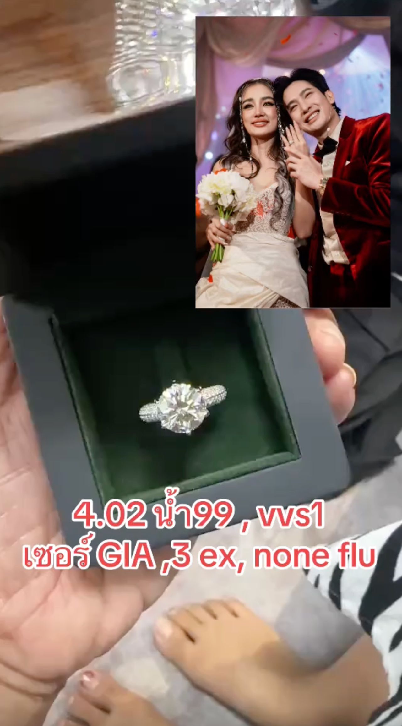 ล่าสุด แฟนๆ ขอให้กระแตโชว์แหวนในระหว่างที่กำลังไลฟ์พูดคุยกับแฟนๆ และกระแตก็ได้โชว์แหวนเพชรให้ดูแบบใกล้ๆ ชัดๆ บอกเลยว่า เพชรเม็ดใหญ่มากกกก และน้ำก็งามแบบสุดๆ โดยแหวนวงนี้ที่โตชิไปแอบสั่งมาให้กระแต ตอนใส่เลยทำให้หลวมนิดหน่อย และแหวนเพชรเม็ดนี้มีขนาด 4.02 กะรัต น้ำ 99, VVS1 เซอร์ GIA, 3 EX, None Flu ราคา 6.5 ล้าน ก็เท่านั้นเอง