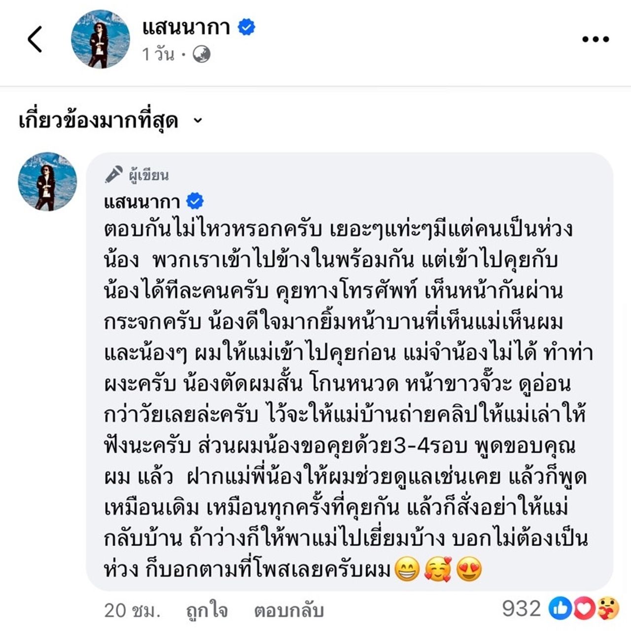 หลังจากนั้น แสน นากา โพสต์ภาพคุณแม่นอนหลับ และเขียนข้อความว่า “#คนสวยของผม หลังจากที่นอนไม่หลับหลายวันครับ ได้คุยกับลูกชายแล้ว สบายใจแล้วครับ”